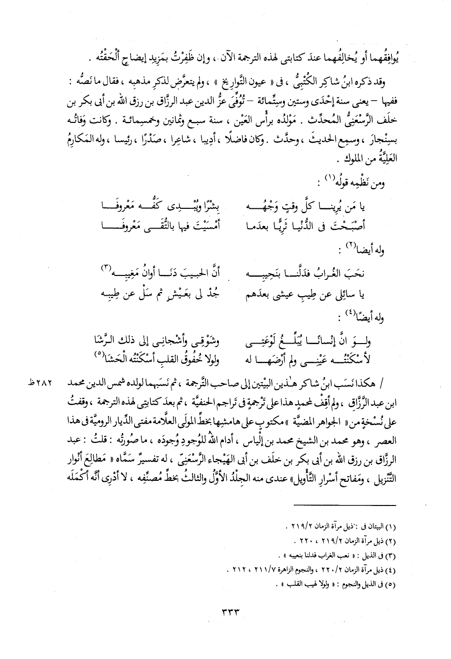 /هكذا نسب ابن شاكر هذين البيتين إلى صاحب التّرجمة، ثم نسبهما لولده شمس الدين محمد ابن عبد الرّزّاق، و لم أقف لمحمد هذا على ترجمة فى تراجم الحنفيّة، ثم بعد كتابتى لهذه الترجمة، وقفت على نسخة من «الجواهر المضيّة» مكتوب على هامشها بخطّ المولى العلاّمة مفتى الدّيار الروميّة فى هذا العصر، و هو محمد بن الشيخ محمد بن إلياس، أدام اللّه للوجود وجوده، ما صورته: قلت: عبد الرزّاق بن رزق اللّه بن أبى بكر بن خلف بن أبى الهيجاء الرّسعنىّ، له تفسير سمّاه «مطالع أنوار التّنزيل، و مفاتح أسرار التّأويل» عندى منه الجلد الأوّل و الثالث بخطّ مصنّفه، لا أدرى أنّه أكمله