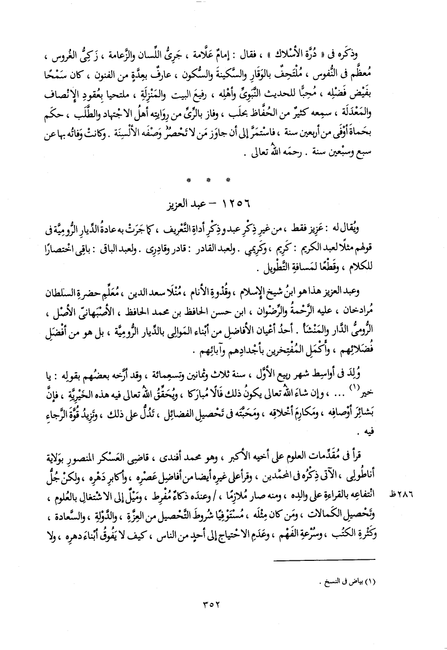و يقال له: عزيز فقط، من غير ذكر عبد و ذكر أداة التّعريف، كما جرت به عادة الدّيار الرّوميّة فى قولهم مثلا لعبد الكريم: كريم، و كريمى. و لعبد القادر: قادر و قادرى. و لعبد الباقى: باقى اختصارا للكلام، و قطعا لمسافة التّطويل.
