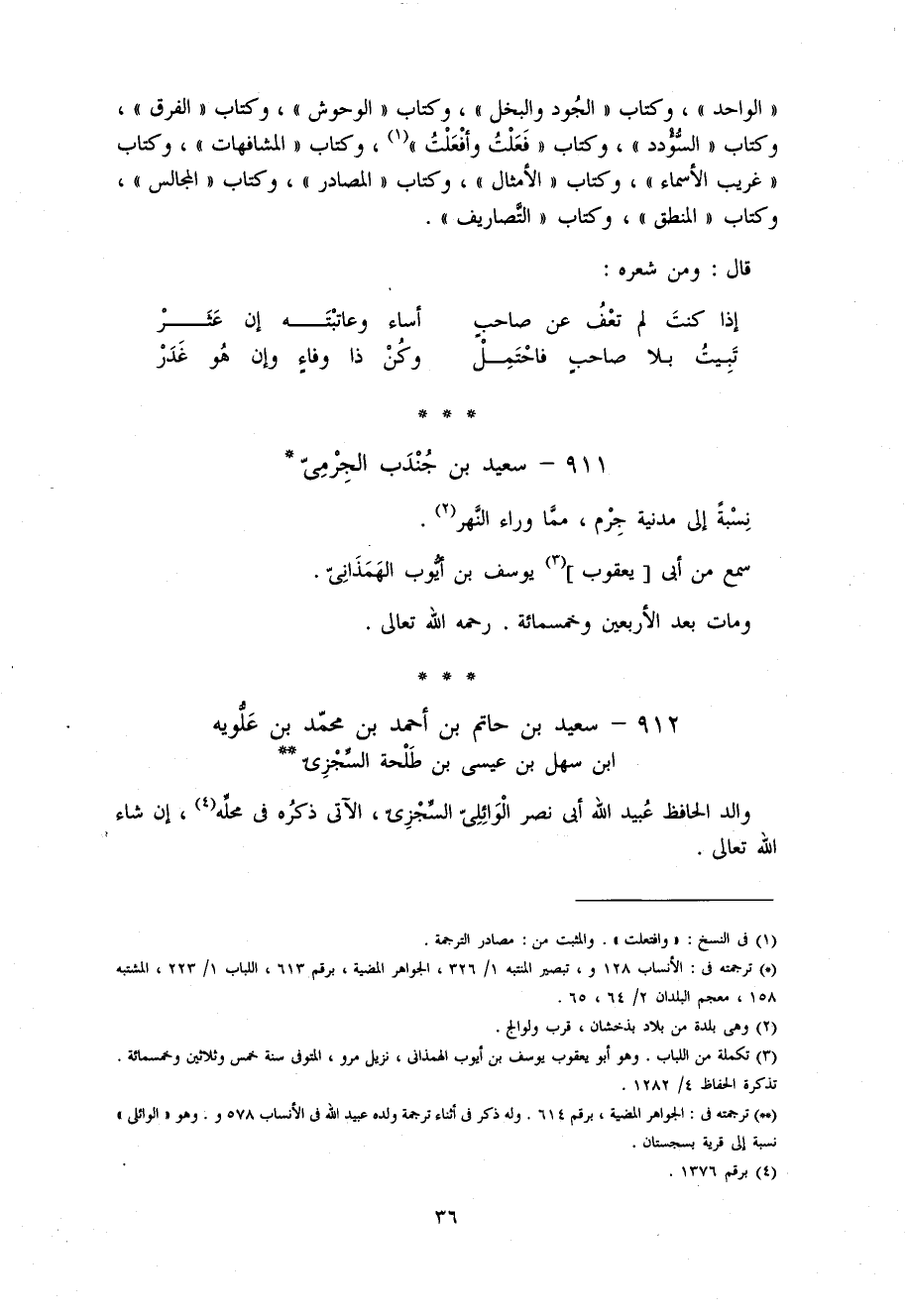 **) ترجمته فى: الجواهر المضية، برقم 614. و له ذكر فى أثناء ترجمة ولده عبيد اللّه فى الأنساب 578 و. و هو «الوائلى» نسبة إلى قرية بسجستان.