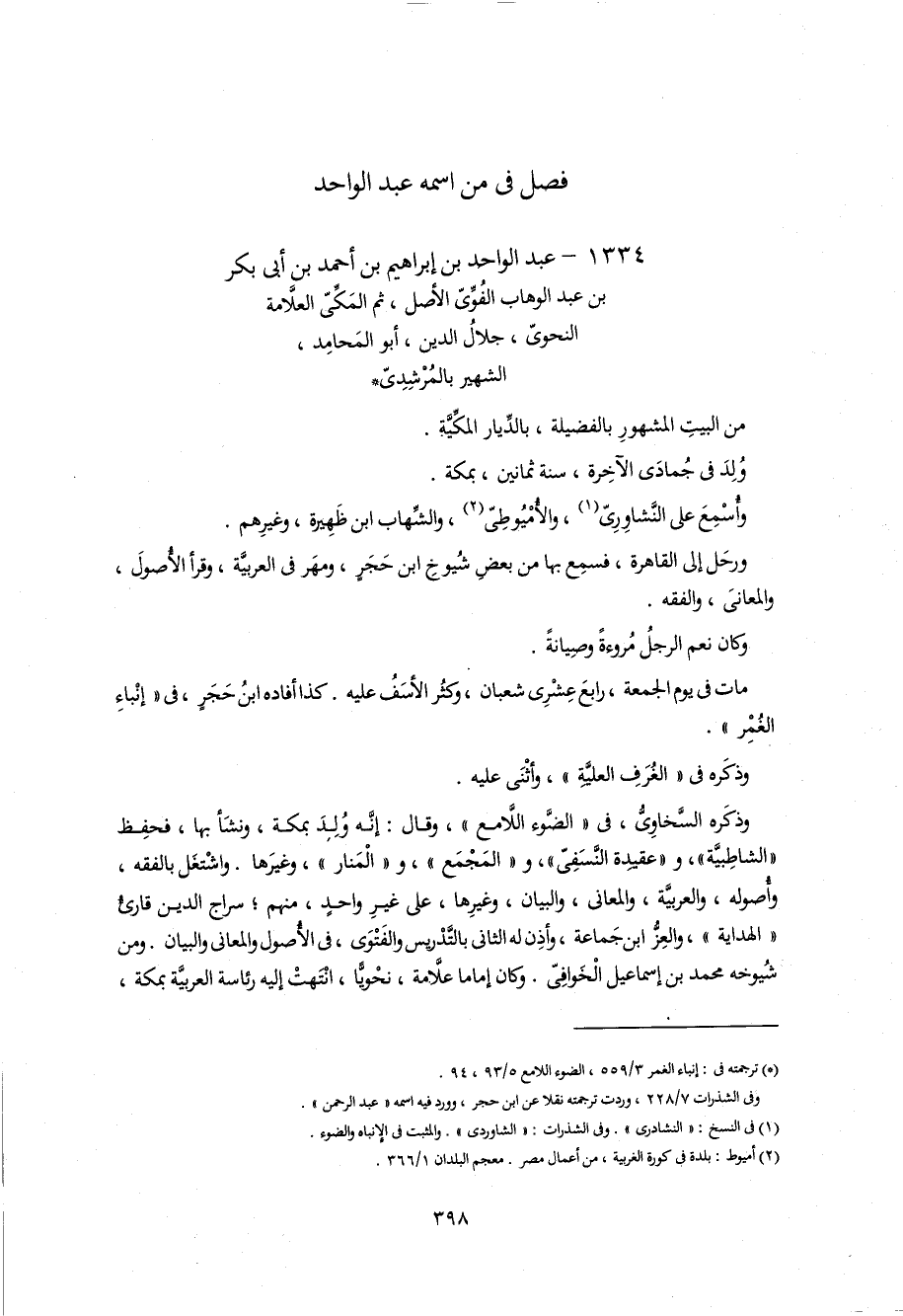 1334 - عبد الواحد بن إبراهيم بن أحمد بن أبى بكر بن عبد الوهاب الفوّىّ الأصل، ثم المكّىّ العلاّمة النحوىّ، جلال الدين، أبو المحامد، الشهير بالمرشدىّ *