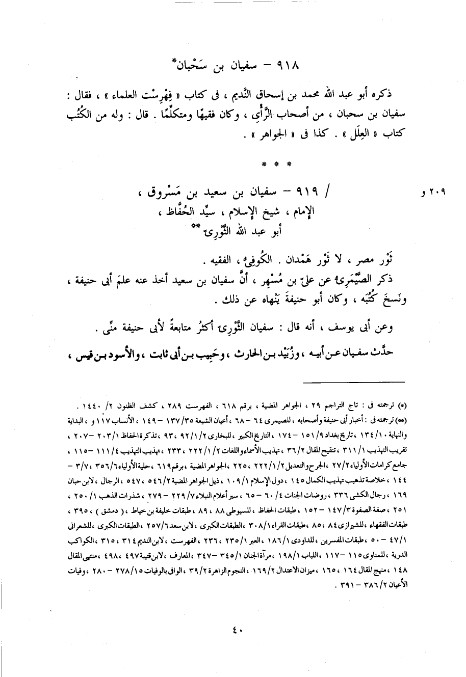 919 - سفيان بن سعيد بن مسروق، الإمام، شيخ الإسلام، سيّد الحفّاظ، أبو عبد اللّه الثّورىّ **