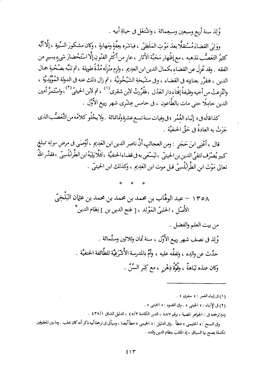 1358 - عبد الوهّاب بن محمد بن محمد بن محمد بن عثمان البلخىّ الأصل، الحلبىّ المولد، [فتح الدين بن] نظام الدين *