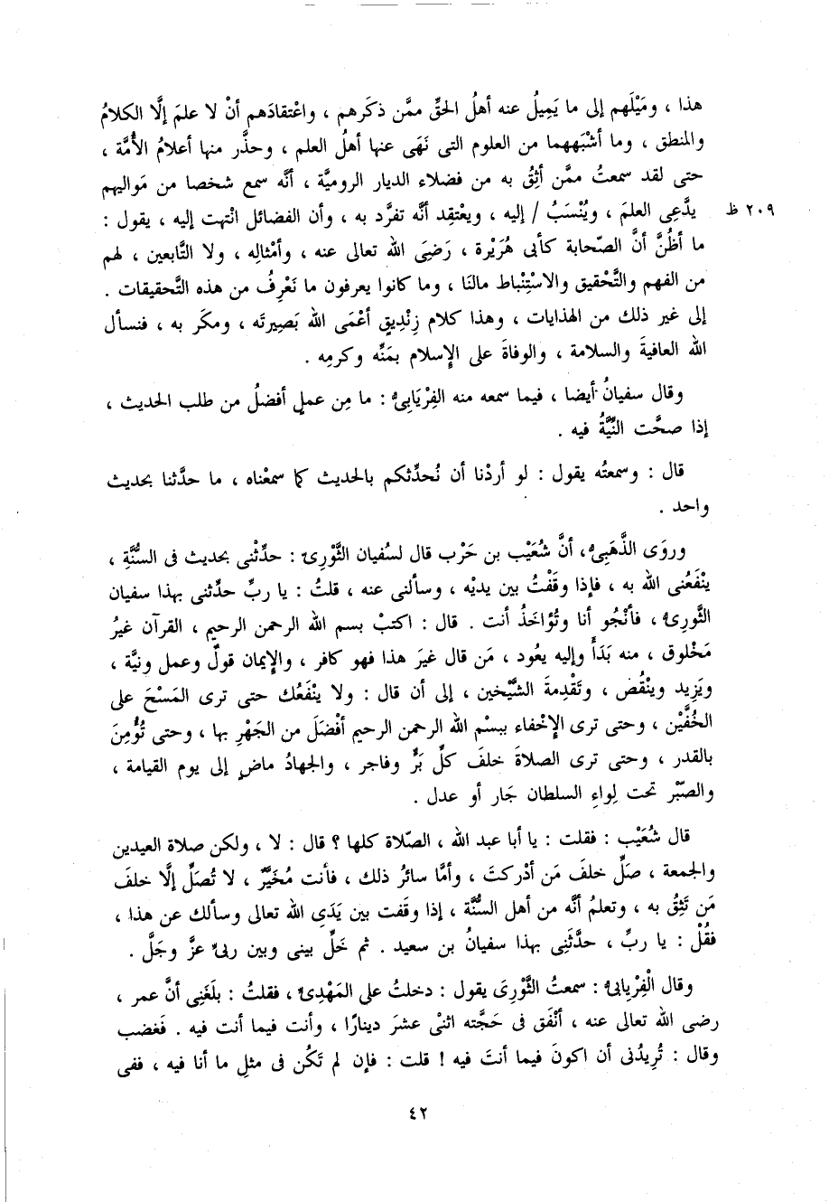 و روى الذّهبىّ، أنّ شعيب بن حرب قال لسفيان الثّورىّ: حدّثنى بحديث فى السّنّة، ينفعنى اللّه به، فإذا وقفت بين يديه، و سألنى عنه، قلت: يا ربّ حدّثنى بهذا سفيان الثّورىّ، فأنجو أنا و تؤاخذ أنت. قال: اكتب بسم اللّه الرحمن الرحيم، القرآن غير مخلوق، منه بدأ و إليه يعود، من قال غير هذا فهو كافر، و الإيمان قول و عمل و نيّة، و يزيد و ينقص، و تقدمة الشّيخين، إلى أن قال: و لا ينفعك حتى ترى المسح على الخفّين، و حتى ترى الإخفاء ببسم اللّه الرحمن الرحيم أفضل من الجهر بها، و حتى تؤمن بالقدر، و حتى ترى الصلاة خلف كلّ برّ و فاجر، و الجهاد ماض إلى يوم القيامة، و الصّبر تحت لواء السلطان جار أو عدل.