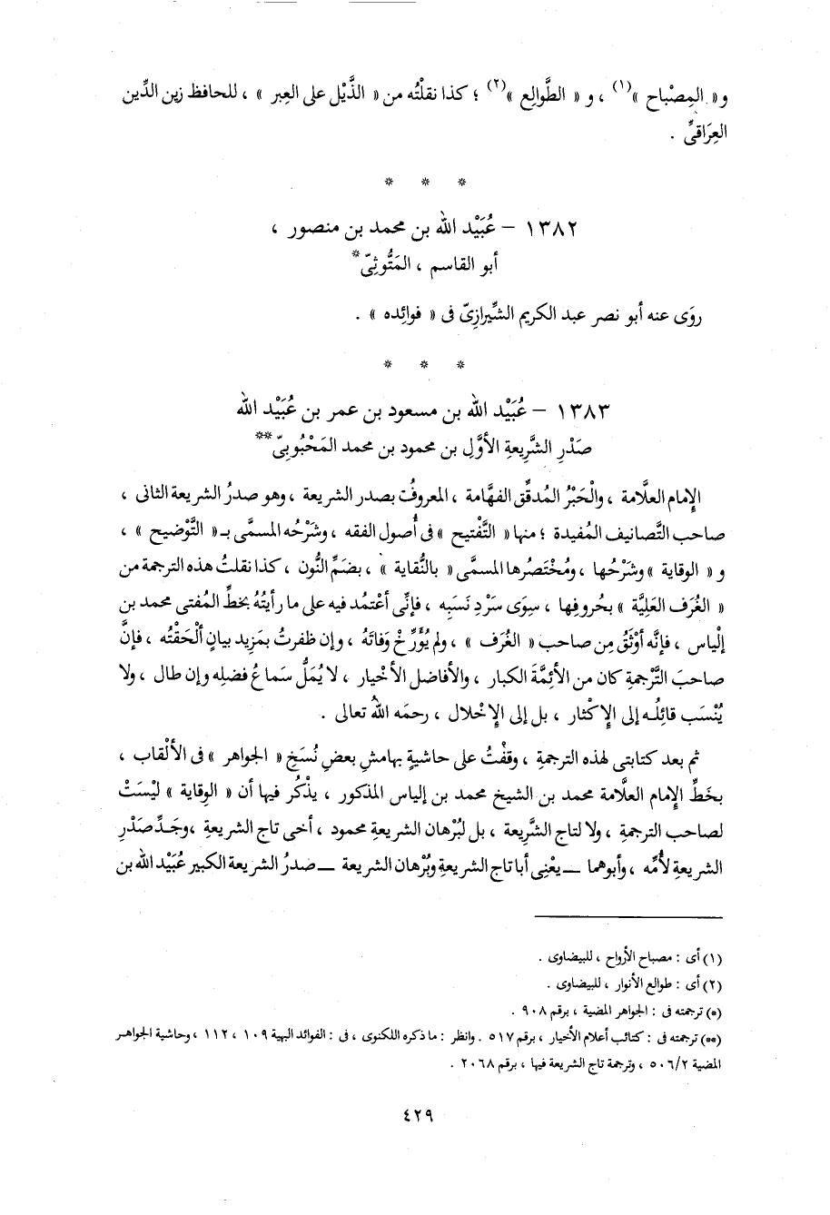 1383 - عبيد اللّه بن مسعود بن عمر بن عبيد اللّه صدر الشّريعة الأوّل بن محمود بن محمد المحبوبىّ **