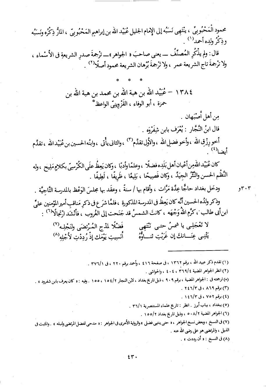 1384 - عبيد اللّه بن هبة اللّه بن محمد بن هبة اللّه بن حمزة، أبو الوفاء، القزوينىّ الواعظ *