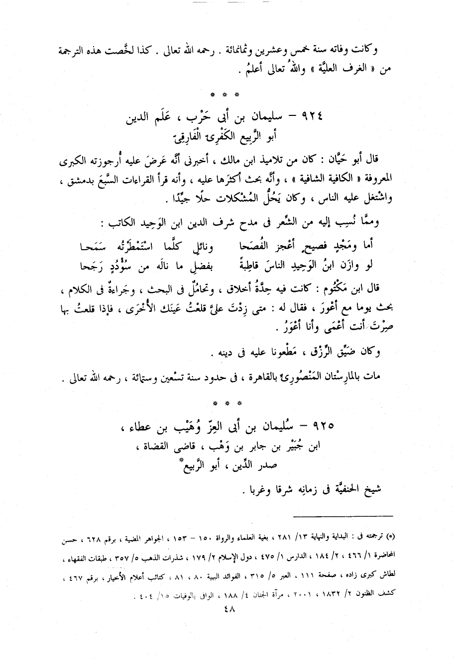 925 - سليمان بن أبى العزّ وهيب بن عطاء، ابن جبير بن جابر بن وهب، قاضى القضاة، صدر الدّين، أبو الرّبيع *