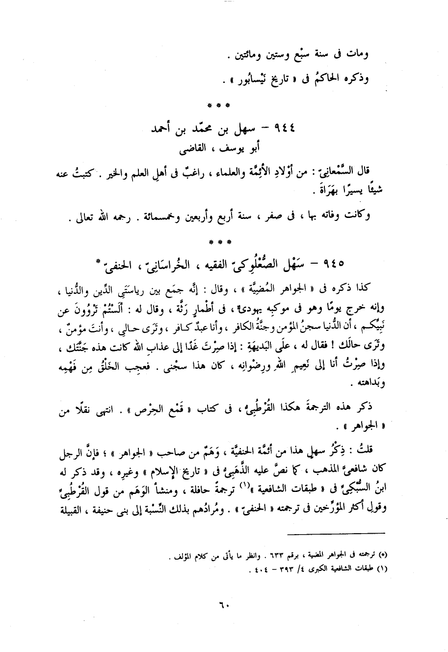 قلت: ذكر سهل هذا من أئمّة الحنفيّة، وهم من صاحب «الجواهر»؛ فإنّ الرجل كان شافعىّ المذهب، كما نصّ عليه الذّهبىّ فى «تاريخ الإسلام» و غيره، و قد ذكر له ابن السّبكىّ فى «طبقات الشافعية» 1 ترجمة حافلة، و منشأ الوهم من قول القرطبىّ و قول أكثر المؤرّخين فى ترجمته «الحنفىّ». و مرادهم بذلك النّسبة إلى بنى حنيفة، القبيلة
