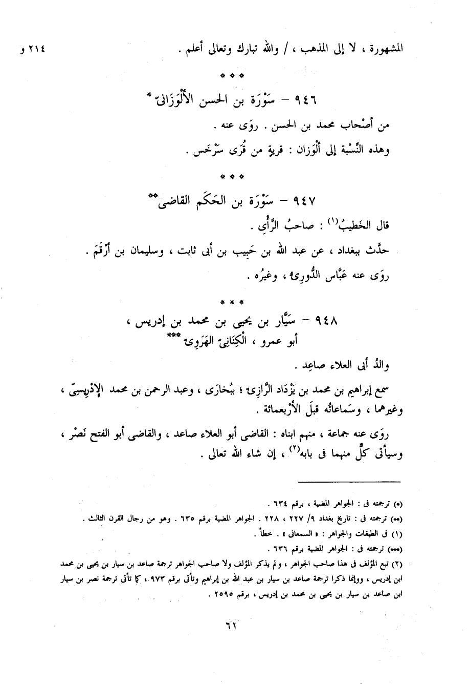 **) ترجمته فى: تاريخ بغداد 9/ 227، 228. الجواهر المضية برقم 635. و هو من رجال القرن الثالث.