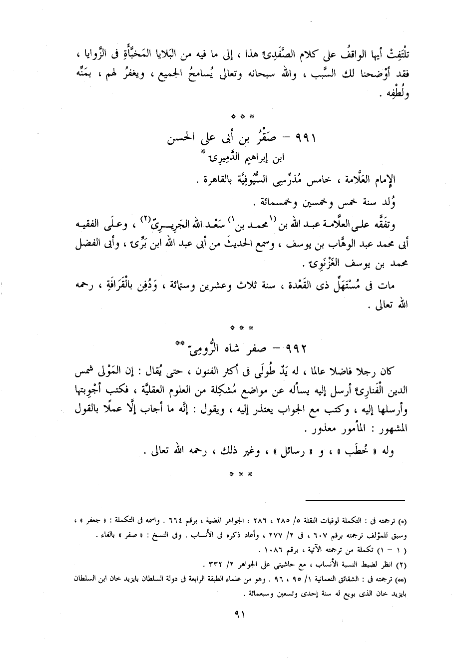91 تلتفت أيها الواقف على كلام الصّفدىّ هذا، إلى ما فيه من البلايا المخبّأة فى الزّوايا، فقد أوضحنا لك السّبب، و اللّه سبحانه و تعالى يسامح الجميع، و يغفر لهم، بمنّه و لطفه.