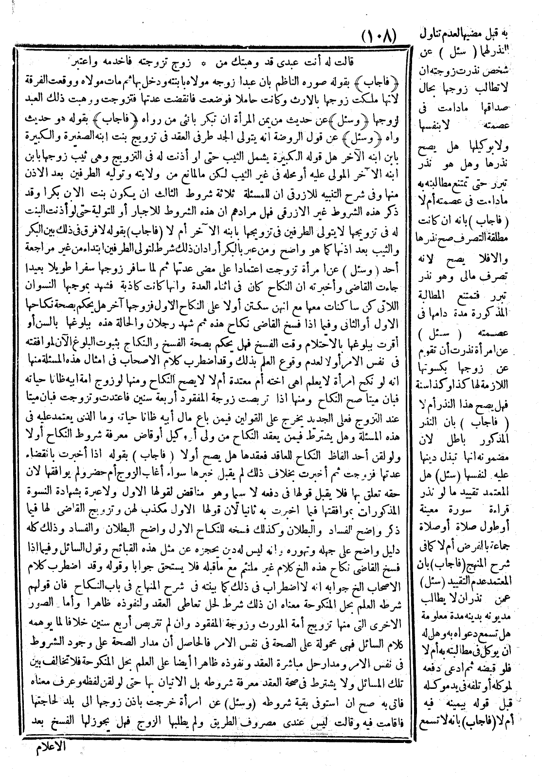 وَكَذَلِكَ فَسْخُهُ لِلنِّكَاحِ الْأَوَّلِ وَاضِحُ الْبُطْلَانِ وَالْفَسَادِ وَذَلِكَ كُلُّهُ دَلِيلٌ وَاضِحٌ عَلَى جَهْلِهِ وَتَهَوُّرِهِ وَأَنَّهُ لَيْسَ لَهُ دِينٌ يَحْجِزُهُ عَنْ مِثْلِ هَذِهِ الْقَبَائِحِ وَقَوْلُ السَّائِلِ وَفِيمَا إذَا فَسَخَ الْقَاضِي نِكَاحَ هَذِهِ إلَخْ كَلَامٌ غَيْرُ مُلْتَئِمٍ مَعَ مَا قَبْلَهُ فَلَا يَسْتَحِقُّ جَوَابًا وَقَوْلُهُ وَقَدْ اضْطَرَبَ كَلَامُ الْأَصْحَابِ إلَخْ جَوَابُهُ أَنَّهُ لَا اضْطِرَابَ فِي ذَلِكَ كَمَا بَيَّنْته فِي شَرْحِ الْمِنْهَاجِ فِي بَابِ النِّكَاحِ فَإِنَّ قَوْلَهُمْ شَرْطُهُ الْعِلْمُ بِحِلِّ الْمَنْكُوحَةِ مَعْنَاهُ أَنَّ ذَلِكَ شَرْطٌ لِحِلِّ تَعَاطِي الْعَقْدِ وَلِنُفُوذِهِ ظَاهِرًا وَأَمَّا الصُّوَرُ الْأُخْرَى الَّتِي مِنْهَا تَزْوِيجُ أَمَةِ الْمُوَرِّثِ وَزَوْجَةِ الْمَفْقُودِ وَإِنْ لَمْ تَتَرَبَّصْ أَرْبَع سِنِينَ خِلَافًا لِمَا يُوهِمُهُ كَلَامُ السَّائِلِ فَهِيَ مَحْمُولَةٌ عَلَى الصِّحَّةِ فِي نَفْس الْأَمْر فَالْحَاصِلُ أَنَّ مَدَارَ الصِّحَّةِ عَلَى وُجُودِ الشُّرُوطِ فِي نَفْسِ الْأَمْرِ وَمَدَارُ حِلِّ مُبَاشَرَةِ الْعَقْدِ وَنُفُوذِهِ ظَاهِرًا أَيْضًا عَلَى الْعِلْمِ بِحِلِّ الْمَنْكُوحَةِ فَلَا تَخَالُفَ بَيْن تِلْكَ الْمَسَائِلِ وَلَا يُشْتَرَطُ فِي صِحَّةِ الْعَقْدِ مَعْرِفَةُ شُرُوطِهِ بَلْ الْإِتْيَانُ بِهَا حَتَّى لَوْ لُقِّنَ لَفْظُهُ وَعَرَفَ مَعْنَاهُ فَأَتَى بِهِ صَحَّ إنْ اسْتَوْفَى بَقِيَّةَ شُرُوطِهِ.