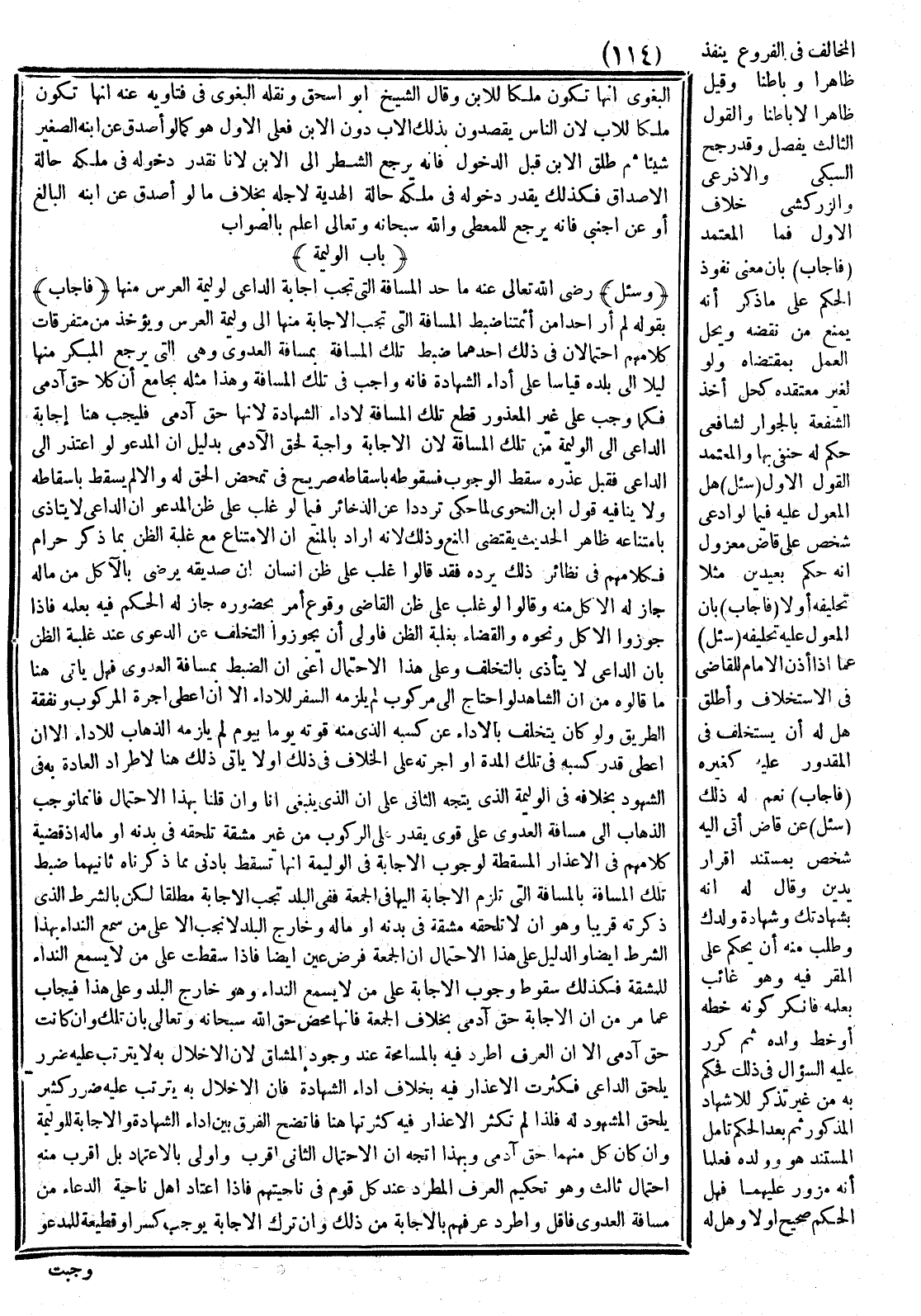 فَلِذَا لَمْ تَكْثُرْ الْأَعْذَارُ فِيهِ كَثْرَتَهَا هُنَا فَاتَّضَحَ الْفَرْقُ بَيْن أَدَاءِ الشَّهَادَةِ وَالْإِجَابَةِ لِلْوَلِيمَةِ وَإِنْ كَانَ كُلٌّ مِنْهُمَا حَقَّ آدَمِيٍّ وَبِهَذَا اتَّجَهَ أَنَّ الِاحْتِمَالَ الثَّانِي أَقْرَبُ وَأَوْلَى بِالِاعْتِمَادِ بَلْ أَقْرَبُ مِنْهُ احْتِمَالٌ ثَالِثٌ وَهُوَ تَحْكِيمُ الْعُرْفِ الْمُطَّرِدِ عِنْد كُلِّ قَوْمٍ فِي نَاحِيَتِهِمْ فَإِذَا اعْتَادَ أَهْلُ نَاحِيَةٍ الدُّعَاءَ مِنْ مَسَافَةِ الْعَدْوَى فَأَقَلَّ وَاطَّرَدَ عُرْفُهُمْ بِالْإِجَابَةِ مِنْ ذَلِكَ وَأَنَّ تَرْكَ الْإِجَابَةِ يُوجِبُ كَسْرًا وَقَطِيعَةً لِلْمَدْعُوِّ