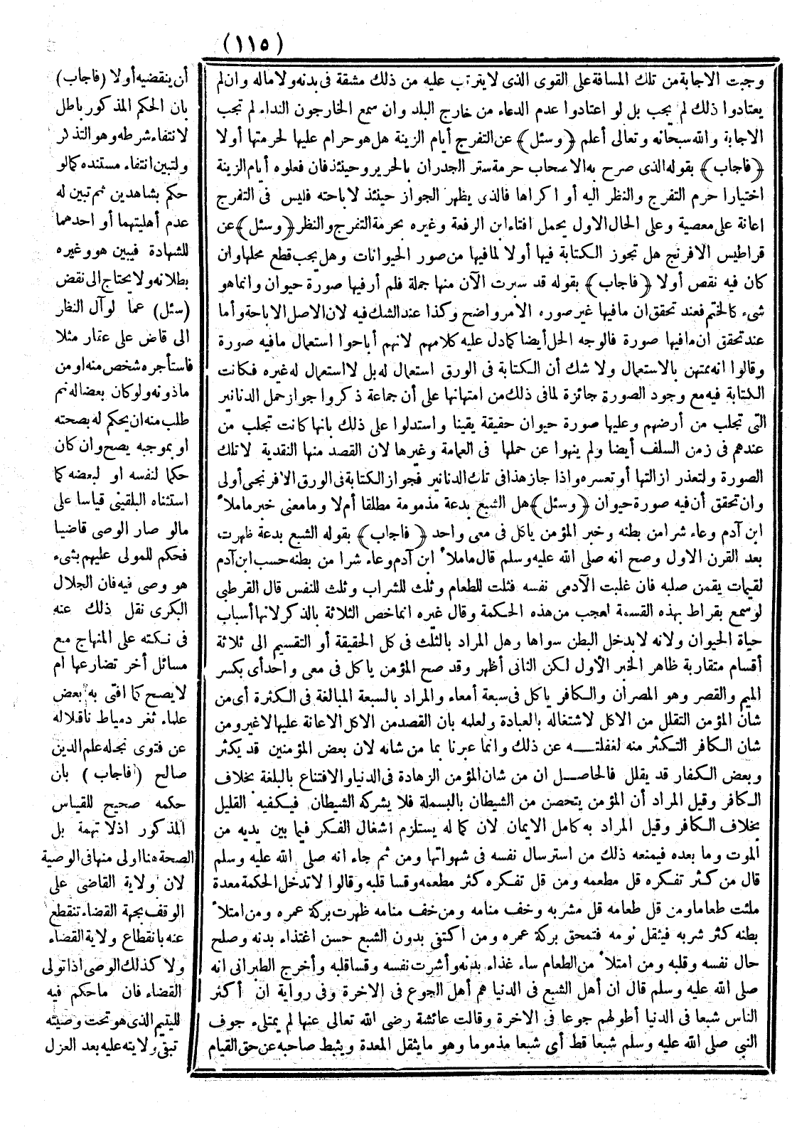 وَقِيلَ الْمُرَادُ بِهِ كَامِلُ الْإِيمَانِ لِأَنَّ كَمَالَهُ يَسْتَلْزِمُ إشْغَال الْفِكْرِ فِيمَا بَيْن يَدَيْهِ مِنْ الْمَوْتِ وَمَا بَعْده فَيَمْنَعُهُ ذَلِكَ مِنْ اسْتِرْسَالِ نَفْسِهِ فِي شَهَوَاتِهَا وَمِنْ ثَمَّ جَاءَ أَنَّهُ - صَلَّى اللَّهُ عَلَيْهِ وَسَلَّمَ - قَالَ «مَنْ كَثُرَ تَفَكُّرُهُ قَلَّ مَطْعَمُهُ وَمَنْ قَلَّ تَفَكُّرُهُ كَثُرَ مَطْعَمُهُ وَقَسَا قَلْبُهُ» وَقَالُوا لَا تَدْخُلُ الْحِكْمَةُ مِعْدَةً مُلِئَتْ طَعَامًا وَمَنْ قَلَّ طَعَامُهُ قَلَّ مَشْرَبُهُ وَخَفّ مَنَامه وَمَنْ خَفَّ مَنَامُهُ ظَهَرَتْ بَرَكَةُ عُمْرِهِ وَمَنْ امْتَلَأَ بَطْنُهُ كَثُرَ شُرْبُهُ فَيَثْقُلُ نَوْمُهُ فَتُمْحَقُ بَرَكَةُ عُمْرِهِ وَمَنْ اكْتَفَى بِدُونِ الشِّبَعِ حَسُنَ اغْتِذَاءُ بَدَنِهِ وَصَلُحَ حَالُ نَفْسِهِ وَقَلْبِهِ وَمَنْ امْتَلَأَ مِنْ الطَّعَامِ سَاءَ غِذَاءُ بَدَنه وَأَشِرَتْ نَفْسُهُ وَقَسَا قَلْبُهُ وَأَخْرَجَ الطَّبَرَانِيُّ أَنَّهُ - صَلَّى اللَّهُ عَلَيْهِ وَسَلَّمَ - قَالَ «إنَّ أَهْل الشِّبَعِ فِي الدُّنْيَا هُمْ أَهْلُ الْجُوعِ فِي الْآخِرَةِ» وَفِي رِوَايَةٍ «إنَّ أَكْثَرَ النَّاسِ شِبَعًا فِي الدُّنْيَا أَطْوَلُهُمْ جُوعًا فِي الْآخِرَةِ» وَقَالَتْ عَائِشَةُ - رَضِيَ اللَّهُ تَعَالَى عَنْهَا - «لَمْ يَمْتَلِئ جَوْفُ النَّبِيِّ - صَلَّى اللَّهُ عَلَيْهِ وَسَلَّمَ - شَبَّعَا قَطُّ» أَيْ شَبَّعَا مَذْمُومًا وَهُوَ مَا يُثْقِلُ الْمَعِدَةَ وَيُثَبِّطُ صَاحِبَهُ عَنْ حَقِّ الْقِيَامِ