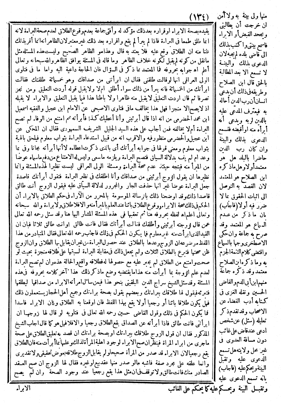 أَجَابَ الشَّيْخُ الْمَذْكُورُ فَقَالَ إنَّ قَوْلَ الزَّوْجِ طَلَاقُكِ بِبَرَاءَتِك أَوْ بِصِحَّةِ بَرَاءَتِكِ إنْ قَصَدَ بِهِ تَعْلِيقَ الطَّلَاقِ عَلَى صِحَّةِ مَا جَرَى مِنْ إبْرَاءِ الْمَرْأَةِ فَيُنْظَرُ إنْ صَحَّ الْإِبْرَاء لِوُجُودِ أَهْلِيَّةِ الْمَرْأَةَ لِذَلِكَ وَعَمَلِهَا بِمَا أَبْرَأَتْ مِنْهُ فَإِنَّ الطَّلَاقَ يَقَعُ رَجْعِيًّا لِأَنَّ الْإِبْرَاء قَدْ صَدَرَ مِنْ الْمَرْأَةِ صَحِيحًا وَلَمْ يُقَابِلْ الزَّوْجُ طَلَاقَهُ بِعِوَضٍ تَحْقِيقِيٍّ وَلَا تَقْدِيرِيٍّ وَإِنَّمَا عَلَّقَهُ عَلَى مُجَرَّدِ صِفَةٍ فَأَشْبَهُ مَا لَوْ صَدَرَ مِنْهَا عَقْدُ بَيْعٍ أَوْ غَيْرِهِ.