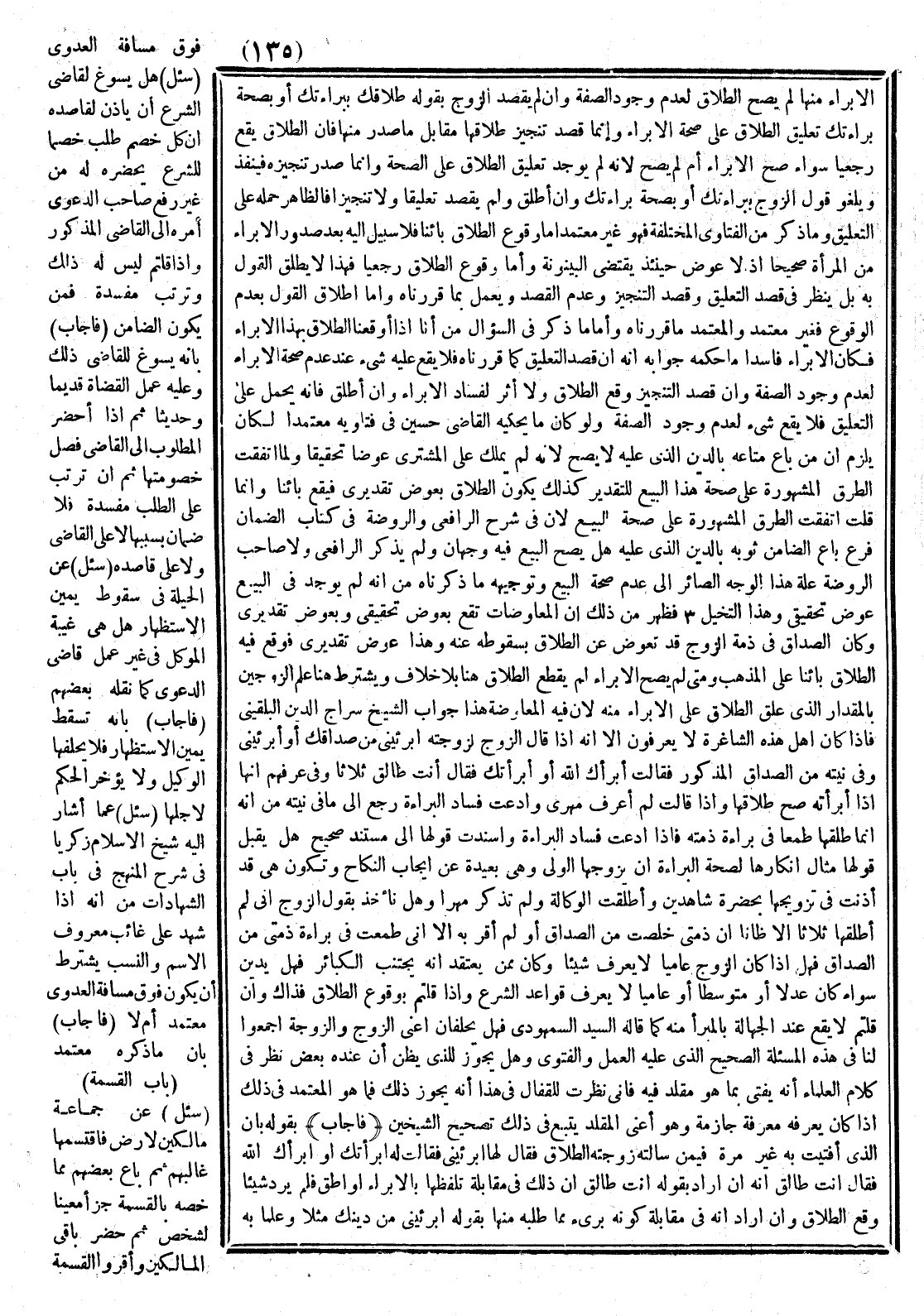 وَأَمَّا وُقُوعُ الطَّلَاقِ رَجْعِيًّا فَهَذَا لَا يُطْلِقُ الْقَوْلَ بِهِ بَلْ يُنْظَرُ فِي قَصْدِ التَّعْلِيقِ وَقَصْدِ التَّنْجِيزِ وَعَدَمِ الْقَصْدِ وَيُعْمَلُ بِمَا قَرَّرْنَاهُ وَأَمَّا إطْلَاقُ الْقَوْلِ بِعَدَمِ الْوُقُوعِ فَغَيْرُ مُعْتَمَدٍ وَالْمُعْتَمَدُ مَا قَرَّرْنَاهُ وَأَمَّا مَا ذُكِرَ فِي السُّؤَالِ مِنْ أَنَّا إذَا أَوْقَعْنَا الطَّلَاقَ بِهَذَا الْإِبْرَاء فَكَانَ الْإِبْرَاء فَاسِدًا مَا حُكْمُهُ جَوَابُهُ أَنَّهُ إنْ قَصَدَ التَّعْلِيقَ كَمَا قَرَّرْنَا فَلَا يَقَعُ عَلَيْهِ شَيْءٌ عِنْد عَدَمِ صِحَّةِ الْإِبْرَاء لِعَدَمِ وُجُودِ الصِّفَةِ وَإِنْ قَصَدَ التَّنْجِيزَ وَقَعَ الطَّلَاقُ وَلَا أَثَرَ لِفَسَادِ الْإِبْرَاءِ وَإِنْ أَطْلَقَ فَإِنَّهُ يُحْمَلُ عَلَى التَّعْلِيقِ فَلَا يَقَعُ شَيْءٌ لِعَدَمِ وُجُودِ الصِّفَةِ وَلَوْ كَانَ مَا يَحْكِيهِ الْقَاضِي حُسَيْن فِي فَتَاوِيهِ مُعْتَمَدًا لَكَانَ يَلْزَمُ أَنَّ مَنْ بَاعَ مَتَاعَهُ بِالدَّيْنِ الَّذِي عَلَيْهِ لَا يَصِحُّ لِأَنَّهُ لَمْ يَمْلِكْ عَلَى الْمُشْتَرِي عِوَضًا تَحْقِيقًا وَلَمَّا اتَّفَقَتْ الطُّرُقُ الْمَشْهُورَةُ عَلَى صِحَّةِ هَذَا الْبَيْعِ لِلتَّقْدِيرِ كَذَلِكَ يَكُونُ الطَّلَاقُ بَعُوضٍ تَقْدِيرِيّ فَيَقَعُ بَائِنًا وَإِنَّمَا قُلْت اتَّفَقَتْ الطُّرُقُ الْمَشْهُورَةُ عَلَى صِحَّةِ الْبَيْعِ لِأَنَّ فِي شَرْحِ الرَّافِعِيِّ وَالرَّوْضَةِ فِي كِتَابِ الضَّمَانِ.