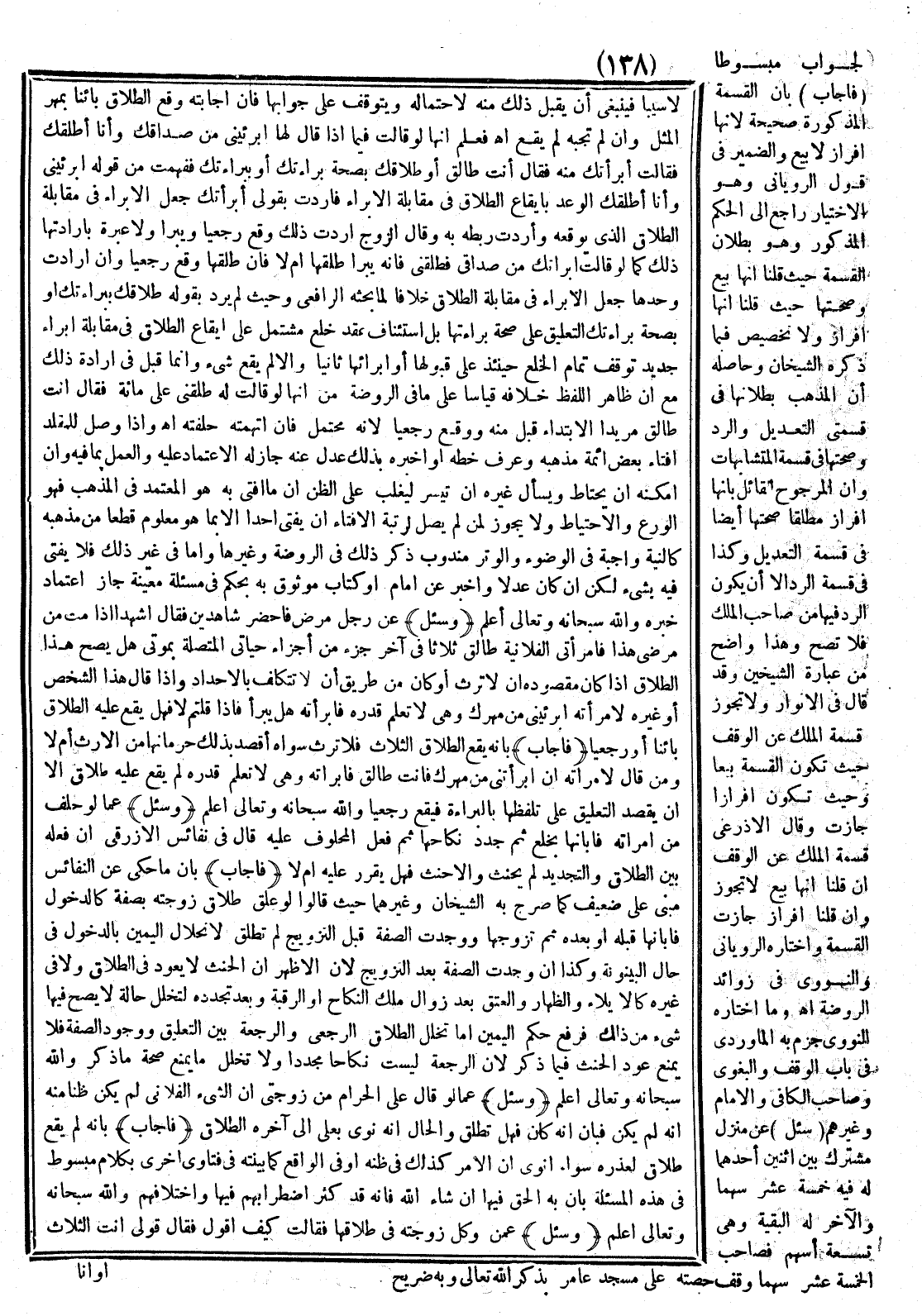 (فَأَجَابَ) بِأَنَّ مَا حُكِيَ عَنْ النَّفَائِسِ مَبْنِيٌّ عَلَى ضَعِيفٍ كَمَا صَرَّحَ بِهِ الشَّيْخَانِ وَغَيْرُهُمَا حَيْثُ قَالُوا لَوْ عَلَّقَ طَلَاقَ زَوْجَتِهِ بِصِفَةٍ كَالدُّخُولِ فَأَبَانَهَا قَبْلَهُ أَوْ بَعْدَهُ ثُمَّ تَزَوَّجَهَا وَوُجِدَتْ الصِّفَةُ قَبْلَ التَّزْوِيجِ لَمْ يُطَلِّقْ لِانْحِلَالِ الْيَمِينِ بِالدُّخُولِ فِي حَالِ الْبَيْنُونَةِ وَكَذَا إنْ وُجِدَتْ الصِّفَةُ بَعْد التَّزْوِيجِ لِأَنَّ الْأَظْهَرَ أَنَّ الْحِنْثَ لَا يَعُودُ فِي الطَّلَاقِ وَلَا فِي غَيْرِهِ كَالْإِيلَاءِ وَالظِّهَارِ وَالْعِتْقِ بَعْد زَوَالِ مِلْكِ النِّكَاحِ أَوْ الرَّقَبَةِ وَبَعْد تَجَدُّدِهِ لِتَخَلُّلِ حَالَةٍ لَا يَصِحُّ فِيهَا شَيْءٌ مِنْ ذَلِكَ فَرُفِعَ حُكْمُ الْيَمِينِ أَمَّا تَخَلُّلُ الطَّلَاقِ الرَّجْعِيِّ وَالرَّجْعَةُ بَيْن التَّعْلِيقِ وَوُجُودِ الصِّفَةِ فَلَا يَمْنَعُ عَوْدَ الْحِنْثِ فِيمَا ذُكِرَ لِأَنَّ الرَّجْعَةَ لَيْسَتْ نِكَاحًا مُجَدَّدًا وَلَا تُخَلِّلُ مَا يَمْنَعُ صِحَّةَ مَا ذُكِرَ، وَاَللَّهَ سُبْحَانه وَتَعَالَى أَعْلَمُ.