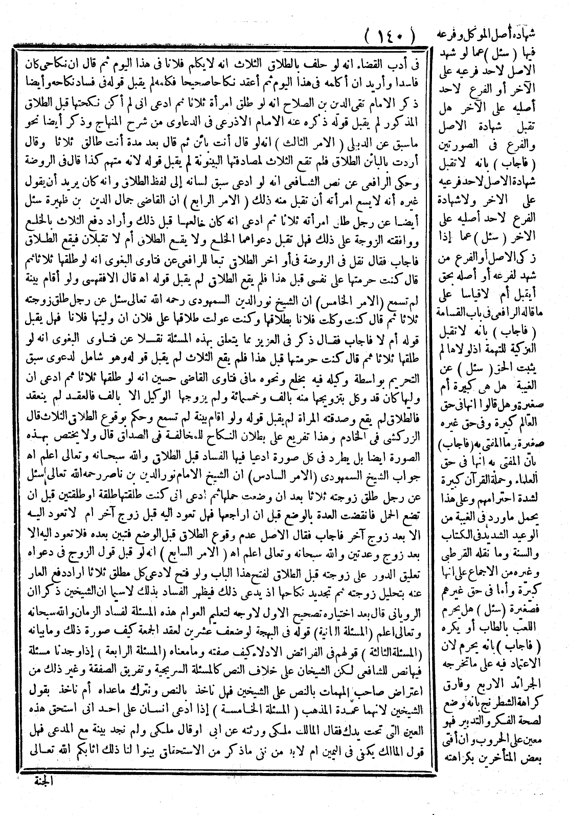 (الْأَمْرُ السَّابِعُ) أَنَّهُ لَوْ قُبِلَ قَوْلُ الزَّوْجِ فِي دَعْوَاهُ تَعْلِيقَ الدَّوْرِ عَلَى زَوْجَتِهِ قَبْل الطَّلَاقِ لَفُتِحَ هَذَا الْبَابُ وَلَوْ فُتِحَ لَادُّعِيَ كُلُّ مُطَلِّقٌ ثَلَاثًا أَرَادَ دَفْعَ الْعَارِ عَنْهُ بِتَحْلِيلِ زَوْجَتِهِ ثُمَّ تَجْدِيدَ نِكَاحِهَا إذْ يَدَّعِي ذَلِكَ فَيَظْهَرُ الْفَسَادُ بِذَلِكَ لَا سِيَّمَا أَنَّ الشَّيْخَيْنِ ذَكَرَا أَنَّ الرُّويَانِيّ قَالَ بَعْد اخْتِيَارِهِ تَصْحِيحَ الْأَوَّلِ لَا وَجْهَ لِتَعْلِيمِ الْعَوَامّ هَذِهِ الْمَسْأَلَةَ لِفَسَادِ الزَّمَانِ وَاَللَّهُ سُبْحَانَهُ وَتَعَالَى أَعْلَمُ (الْمَسْأَلَةُ الثَّانِيَة) قَوْلُهُ فِي الْبَهْجَةِ لَوْ ضِعْفُ عِشْرِينَ لِعَقْدِ الْجُمُعَةِ كَيْفَ صُورَةُ ذَلِكَ وَمَا بَيَانُهُ (الْمَسْأَلَةُ الثَّالِثَةُ) قَوْلُهُمْ فِي الْفَرَائِضِ الْإِدْلَاءُ كَيْفَ صِفَته وَمَا مَعْنَاهُ (الْمَسْأَلَةُ الرَّابِعَةُ) إذَا وَجَدْنَا مَسْأَلَةً فِيهَا نَصٌّ لِلشَّافِعِيِّ لَكِنْ الشَّيْخَانِ عَلَى خِلَافِ النَّصِّ كَالْمَسْأَلَةِ السُّرَيْجِيَّة وَتَفْرِيقِ الصَّفْقَةِ وَغَيْرِ ذَلِكَ مِنْ اعْتِرَاضِ صَاحِبِ الْمُهِمَّاتِ بِالنَّصِّ عَلَى الشَّيْخَيْنِ فَهَلْ نَأْخُذُ بِالنَّصِّ وَنَتْرُكُ مَا عَدَاهُ أَمْ نَأْخُذُ بِقَوْلِ الشَّيْخَيْنِ لَأَنَّهُمَا عُمْدَةُ الْمَذْهَبِ (الْمَسْأَلَةُ الْخَامِسَةُ) إذَا ادَّعَى إنْسَانٌ عَلَى أَحَدٍ أَنِّي أَسْتَحِقُّ هَذِهِ الْعَيْنَ الَّتِي تَحْتَ يَدِك فَقَالَ الْمَالِكُ مِلْكِي وَرِثْته عَنْ أَبِي أَوْ قَالَ مِلْكِي وَلَمْ نَجِدْ بَيِّنَةً مَعَ الْمُدَّعِي