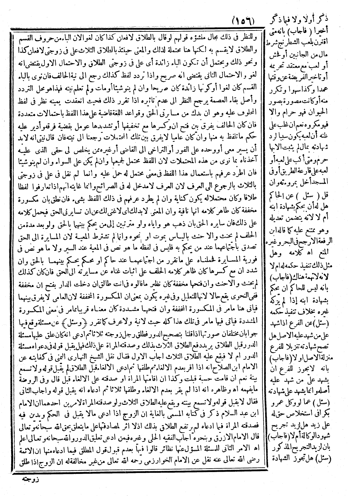 (أَجَابَ الْأَوَّلُ) فَقَالَ: نَقَلَ الشَّيْخُ النَّهَارِيُّ الْيَمَنِيُّ فِي كِفَايَتِهِ عَنْ الْإِمَامِ ابْنِ الصَّلَاحِ أَنَّهُ إذَا أَقَرَّ بِعَدَمِ الْإِلْغَاءِ ثُمَّ طَلَّقَهَا ثُمَّ ادَّعَى الْإِلْقَاءَ قَبْلَ الطَّلَاقِ لَمْ يُقْبَلْ قَوْلُهُ وَلَا تُسْمَعُ بَيِّنَتُهُ. نَعَمْ إنْ قَامَتْ حِسْبَةٌ قُبِلَتْ، وَكَذَا إنْ أَقَامَتْهَا الْمَرْأَةُ، أَوْ صَدَّقَتْهُ عَلَى الْإِلْغَاءِ قُبِلَ قَالَ: وَفِي الرَّوْضَةِ مَا يُفْهِمُهُ. اهـ. وَظَاهِرُهُ أَنَّهُ إذَا لَمْ يُقِرَّ بِعَدَمِ الْإِلْغَاءِ وَطَلَّقَهَا ثَلَاثًا ثُمَّ ادَّعَاهُ أَنَّهُ يُقْبَلُ قَوْلُهُ.