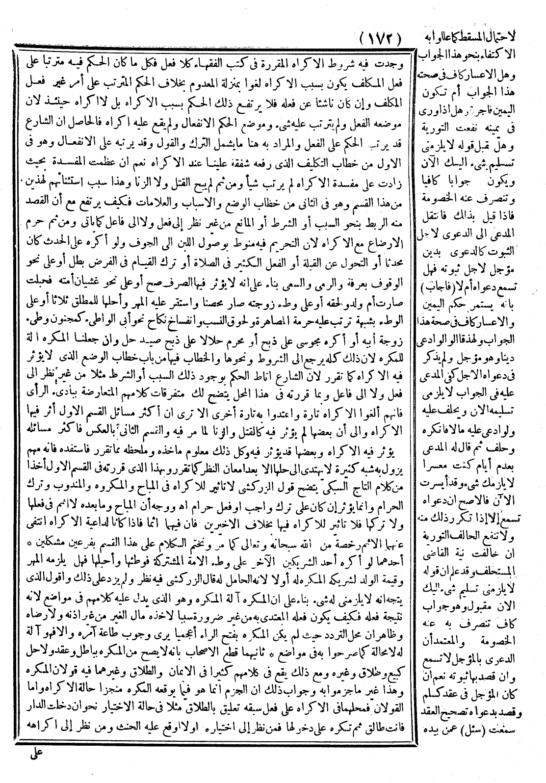 وَبِهَذَا الَّذِي قَرَّرْته فِي الْقِسْمِ الْأَوَّلِ أَخْذًا مِنْ كَلَامِ التَّاجِ السُّبْكِيّ يَتَّضِحُ قَوْلُ الزَّرْكَشِيّ: لَا تَأْثِيرَ لِلْإِكْرَاهِ فِي الْمُبَاحِ وَالْمَكْرُوهِ وَالْمَنْدُوبِ وَتَرْكِ الْحَرَامِ وَإِنَّمَا يُؤَثِّرُ إنْ كَانَ عَلَى تَرْكِ وَاجِبٍ، أَوْ فِعْلِ حَرَامٍ. اهـ. وَوَجْهُهُ أَنَّ الْمُبَاحَ وَمَا بَعْدَهُ لَا إثْمَ فِي فِعْلِهَا وَلَا تَرْكِهَا فَلَا تَأْثِيرَ لِلْإِكْرَاهِ فِيهَا بِخِلَافِ الْأَخِيرَيْنِ فَإِنَّ فِيهِمَا إثْمًا فَإِذَا كَانَا لِدَاعِيَةِ الْإِكْرَاهِ انْتَفَى عَنْهُمَا الْإِثْمُ رُخْصَةً مِنْ اللَّهِ سُبْحَانَهُ وَتَعَالَى كَمَا مَرَّ. وَنَخْتِمُ الْكَلَامَ عَلَى هَذَا الْقِسْمِ بِفَرْعَيْنِ مُشْكِلَيْنِ: أَحَدُهُمَا لَوْ أَكْرَهَ أَحَدُ الشَّرِيكَيْنِ الْآخَرَ عَلَى وَطْءِ الْأَمَةِ الْمُشْتَرَكَةِ فَوَطِئَهَا وَأَحْبَلَهَا فَهَلْ يَلْزَمُهُ الْمَهْرُ وَقِيمَةُ الْوَلَدِ لِشَرِيكِهِ الْمُكْرِهِ لَهُ أَوْ لَا لَا لِأَنَّهُ الْحَامِلُ لَهُ قَالَ الزَّرْكَشِيُّ فِيهِ نَظَرٌ وَلَمْ يَزِدْ عَلَى ذَلِكَ.