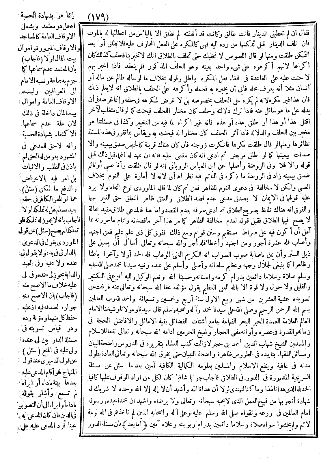 بِسْمِ اللَّهِ الرَّحْمَنِ الرَّحِيمِ وَصَلَّى اللَّهُ عَلَى سَيِّدِنَا مُحَمَّدٍ وَآلِهِ وَصَحْبِهِ وَسَلَّمَ. قَالَ سَيِّدُنَا وَمَوْلَانَا وَشَيْخُنَا الْإِمَامُ الْعَالِمُ الْعَلَّامَةُ الْعُمْدَةُ الْحَبْرُ الْبَحْرُ الْفَهَّامَةُ جَامِعُ أَشْتَاتِ الْفَضَائِلِ بَقِيَّةُ الْأَمَاثِلِ وَالْأَفَاضِلِ الْحُجَّةُ فِي زَمَانِهِ وَالْقُدْوَةُ فِي عَصْرِهِ وَأَوَانِهِ مُفْتَى الْحِجَازِ وَشَيْخُ الْحَرَمَيْنِ أَدَامَهُ اللَّهُ سُبْحَانَهُ وَتَعَالَى نَفْعًا لِلْإِسْلَامِ وَالْمُسْلِمِينَ الشَّيْخُ شِهَابُ الدِّينِ أَحْمَدُ بْنُ حَجَرٍ، لَا زَالَتْ كُتُبُ الْعُلَمَاءِ بِتَقْرِيرِهِ فِي الدُّرُوسِ وَاضِحَةَ الْبَيَانِ، وَمَسَائِلُ الْفُقَهَاءِ بِتَأْيِيدِهِ فِي الطُّرُوسِ ظَاهِرَةً وَاضِحَةَ التِّبْيَانِ حَتَّى يَخْرِقَ اللَّهُ سُبْحَانَهُ وَتَعَالَى الْعَادَةَ بِطُولِ مُدَّتِهِ فِي عَافِيَةٍ وَيَنْفَعَ الْإِسْلَامَ وَالْمُسْلِمِينَ بِعُلُومِهِ الْكَمَالِيَّةِ الْكَافِيَةِ - آمِينَ