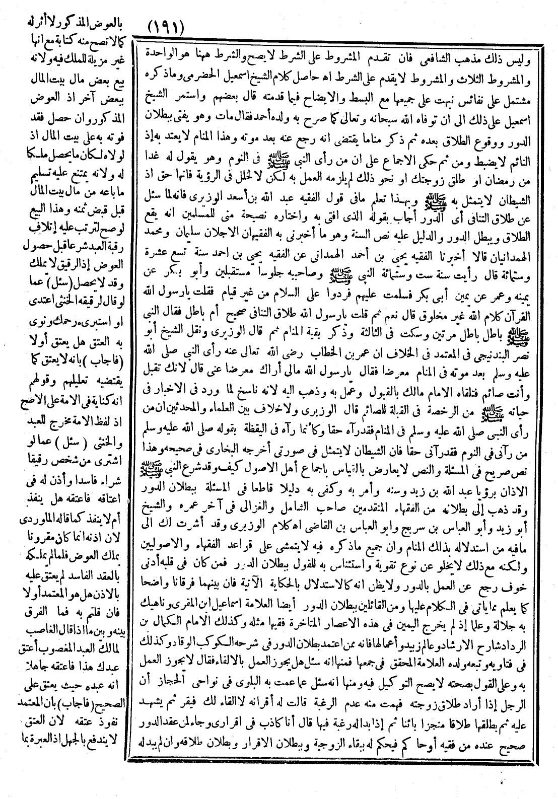 وَالنَّصُّ لَا يُعَارَضُ بِالْقِيَاسِ بِإِجْمَاعِ أَهْلِ الْأُصُولِ كَيْفَ وَقَدْ شَرَعَ النَّبِيُّ - صَلَّى اللَّهُ عَلَيْهِ وَسَلَّمَ - الْأَذَانَ بِرُؤْيَا عَبْدِ اللَّهِ بْنِ زَيْدٍ وَسَنَّ وَأَمَرَ بِهِ وَكَفَى بِهِ دَلِيلًا قَاطِعًا فِي الْمَسْأَلَةِ بِبُطْلَانِ الدَّوْرِ. وَقَدْ ذَهَبَ إلَى بُطْلَانِهِ مِنْ الْفُقَهَاءِ الْمُتَقَدِّمِينَ صَاحِبُ الشَّامِلِ وَالْغَزَالِيُّ فِي آخِرِ عُمُرِهِ وَالشَّيْخُ أَبُو زَيْدٍ وَأَبُو الْعَبَّاسِ بْنُ سُرَيْجٍ وَأَبُو الْعَبَّاسِ بْنُ الْقَاصِّ. اهـ كَلَامُ الْوَزِيرِيِّ وَقَدْ أَشَرْت لَك إلَى مَا فِيهِ مِنْ اسْتِدْلَالِهِ بِذَلِكَ الْمَنَامِ وَأَنَّ جَمِيعَ مَا ذَكَرَهُ فِيهِ لَا يَتَمَشَّى عَلَى قَوَاعِد الْفُقَهَاءِ وَالْأُصُولِيِّينَ وَلَكِنَّهُ مَعَ ذَلِكَ لَا يَخْلُو عَنْ نَوْعِ تَقْوِيَةٍ وَاسْتِئْنَاسٍ بِهِ لِلْقَوْلِ بِبُطْلَانِ الدَّوْرِ فَمَنْ كَانَ فِي قَلْبِهِ أَدْنَى خَوْفٍ رَجَعَ عَنْ الْعَمَلِ بِالدَّوْرِ وَلَا يُظَنُّ أَنَّهُ كَالِاسْتِدْلَالِ بِالْحِكَايَةِ الْآتِيَةِ فَإِنَّ بَيْنَهُمَا فَرْقًا وَاضِحًا كَمَا يُعْلَمُ مِمَّا يَأْتِي الْكَلَامُ عَلَيْهَا، وَمِنْ الْقَائِلِينَ بِبُطْلَانِ الدَّوْرِ أَيْضًا الْعَلَّامَةُ إسْمَاعِيلُ بْنُ الْمُقْرِي وَنَاهِيكَ بِهِ جَلَالَةً وَعِلْمًا إذْ لَمْ يُخْرِجْ الْيَمَنُ فِي هَذِهِ الْأَعْصَارِ الْمُتَأَخِّرَةِ فَقِيهًا مِثْلَهُ، وَكَذَلِكَ الْإِمَامُ الْكَمَالُ بْنُ الرَّدَّادِ شَارِحُ الْإِرْشَادِ وَعَالِمُ زُبَيْدٍ وَأَعْمَالِهَا فَإِنَّهُ مِمَّنْ اعْتَمَدَ بُطْلَانَ الدَّوْرِ فِي شَرْحِهِ الْكَوْكَبَ الْوَقَّادَ وَكَذَلِكَ فِي فَتَاوِيهِ وَتَبِعَهُ وَلَدُهُ الْعَلَّامَةُ الْمُحَقِّقُ فِي جَمْعِهَا فَمِنْهَا أَنَّهُ سُئِلَ: هَلْ يَجُوزُ الْعَمَلُ بِالْإِلْقَاءِ فَقَالَ: لَا يَجُوزُ الْعَمَلُ بِهِ وَعَلَى الْقَوْلِ بِصِحَّتِهِ لَا يَصِحُّ التَّوْكِيلُ فِيهِ، وَمِنْهَا أَنَّهُ سُئِلَ عَمَّا عَمَّتْ بِهِ الْبَلْوَى فِي نَوَاحِي الْحِجَازِ أَنَّ الرَّجُلَ إذَا أَرَادَ طَلَاقَ زَوْجَتِهِ فَهِمَتْ مِنْهُ عَدَمَ الرَّغْبَةِ قَالَتْ لَهُ: أَقِرَّ أَنَّهُ لَا إلْقَاءَ لَك فَيُقِرُّ ثُمَّ يُشْهِدُ عَلَيْهِ ثُمَّ يُطَلِّقُهَا طَلَاقًا مُنَجَّزًا بَائِنًا ثُمَّ إذَا بَدَا لَهُ رَغْبَةٌ فِيهَا قَالَ: أَنَا كَاذِبٌ فِي إقْرَارِي وَجَاءَ لِمَنْ عَقْدُ الدَّوْرِ صَحِيحٌ عِنْدَهُ مِنْ فَقِيهٍ، أَوْ حَاكِمٍ فَيَحْكُمُ لَهُ بِبَقَاءِ الزَّوْجِيَّةِ وَبِبُطْلَانِ الْإِقْرَارِ وَبُطْلَانِ طَلَاقِهِ وَإِنْ لَمْ يَبْدُ لَهُ