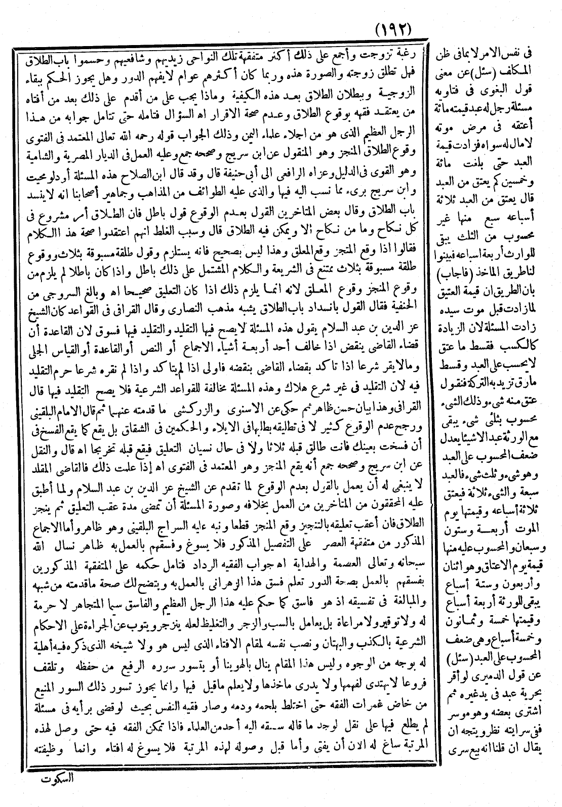 ثَمَّ قَالَ الْإِمَامُ الْبُلْقِينِيُّ: وَرَجَّحَ عَدَمَ الْوُقُوعِ كَثِيرٌ لَا فِي تَطْلِيقِهِ بِطَلَبِهَا فِي الْإِيلَاءِ وَالْحُكْمَيْنِ فِي الشِّقَاقِ بَلْ يَقَعُ كَمَا يَقَعُ الْفَسْخُ فِي إنْ فَسَخْت بِعَيْبِك فَأَنْتِ طَالِقٌ قَبْلَهُ ثَلَاثًا وَلَا فِي حَالِ نِسْيَانِ التَّعْلِيقِ فَيَقَعُ قَبْلَهُ تَخْرِيجًا. اهـ. قَالَ: وَالنَّقْلُ عَنْ ابْنِ سُرَيْجٍ وَصَحَّحَهُ جَمْعٌ أَنَّهُ يَقَعُ الْمُنَجَّزُ وَهُوَ الْمُعْتَمَدُ فِي الْفَتْوَى. اهـ. إذَا عَلِمْت ذَلِكَ فَالْقَاضِي الْمُقَلِّدُ لَا يَنْبَغِي لَهُ أَنْ يَعْمَلَ بِالْقَوْلِ بِعَدَمِ الْوُقُوعِ لِمَا تَقَدَّمَ عَنْ الشَّيْخِ عِزِّ الدِّينِ بْنِ عَبْدِ السَّلَامِ وَلِمَا أَطْبَقَ عَلَيْهِ الْمُحَقِّقُونَ مِنْ الْمُتَأَخِّرِينَ مِنْ الْعَمَلِ بِخِلَافِهِ، وَصُورَةُ الْمَسْأَلَةِ أَنْ تَمْضِيَ مُدَّةُ التَّعْلِيقِ ثُمَّ يُنَجَّزُ الطَّلَاقُ فَإِنْ أَعْقَبَ تَعْلِيقَهُ بِالتَّنْجِيزِ وَقَعَ الْمُنَجَّزُ قَطْعًا وَنَبَّهَ عَلَيْهِ السِّرَاجُ الْبُلْقِينِيُّ وَهُوَ ظَاهِرٌ وَأَمَّا الْإِجْمَاعُ الْمَذْكُورُ مِنْ مُتَفَقِّهَةٍ عَلَى التَّفْصِيلِ الْمَذْكُورِ فَلَا يَسُوغُ، وَفِسْقُهُمْ بِالْعَمَلِ بِهِ ظَاهِرٌ نَسْأَلُ اللَّهَ سُبْحَانَهُ وَتَعَالَى الْعِصْمَةَ وَالْهِدَايَةَ. اهـ جَوَابُ الْفَقِيهِ الرَّدَّادِ فَتَأَمَّلْ حُكْمَهُ عَلَى الْمُتَفَقِّهَةِ الْمَذْكُورِينَ بِفِسْقِهِمْ بِالْعَمَلِ بِصِحَّةِ الدَّوْرِ تَعْلَمْ فِسْقَ هَذَا الزَّهْرَانِيِّ بِالْعَمَلِ بِهِ وَيَتَّضِحُ لَك صِحَّةُ مَا قَدَّمْته مِنْ شَبَهِهِ وَالْمُبَالَغَةِ فِي تَفْسِيقِهِ إذْ هُوَ فَاسِقٌ كَمَا حَكَمَ عَلَيْهِ هَذَا الرَّجُلُ الْعَظِيمُ، وَالْفَاسِقُ - سِيَّمَا الْمُتَجَاهِرُ - لَا حُرْمَةَ لَهُ وَلَا تَوْقِيرَ وَلَا مُرَاعَاةَ بَلْ يُعَامَلُ بِالسَّبِّ وَالزَّجْرِ وَالتَّغْلِيظِ لَعَلَّهُ يَنْزَجِرُ وَيَتُوبُ عَنْ الْجَرَاءَةِ عَلَى الْأَحْكَامِ الشَّرْعِيَّةِ بِالْكَذِبِ وَالْبُهْتَانِ وَنَصْبِ نَفْسِهِ لِمَقَامِ الْإِفْتَاءِ الَّذِي لَيْسَ هُوَ وَلَا شَيْخُهُ الَّذِي ذَكَرَهُ فِيهِ أَهْلِيَّةٌ لَهُ بِوَجْهٍ مِنْ الْوُجُوهِ وَلَيْسَ هَذَا الْمَقَامُ يُنَالُ بِالْهُوَيْنَا، أَوْ يَتَسَوَّرُ سُورَهُ الرَّفِيعَ مَنْ حَفِظَهُ وَتَلَقَّفَ فُرُوعًا لَا يَهْتَدِي لِفَهْمِهَا وَلَا يَدْرِي مَأْخَذَهَا وَلَا يَعْلَمُ مَا قِيلَ فِيهَا وَإِنَّمَا يَجُوزُ تَسَوُّرُ ذَلِكَ السُّورِ الْمَنِيعِ مَنْ خَاضَ غَمَرَاتِ الْفِقْهِ حَتَّى اخْتَلَطَ بِلَحْمِهِ وَدَمِهِ وَصَارَ فَقِيهَ النَّفْسِ بِحَيْثُ لَوْ قَضَى بِرَأْيِهِ فِي مَسْأَلَةٍ لَمْ يَطَّلِعْ فِيهَا عَلَى نَقْلٍ لَوَجَدَ مَا قَالَهُ سَبَقَهُ إلَيْهِ أَحَدٌ مِنْ الْعُلَمَاءِ فَإِذَا تَمَكَّنَ الْفِقْهُ فِيهِ حَتَّى وَصَلَ لِهَذِهِ الْمَرْتَبَةِ سَاغَ لَهُ الْآنَ أَنْ يُفْتِيَ وَأَمَّا قَبْلَ وُصُولِهِ لِهَذِهِ الْمَرْتَبَةِ فَلَا يَسُوغُ لَهُ إفْتَاءٌ وَإِنَّمَا وَظِيفَتُهُ