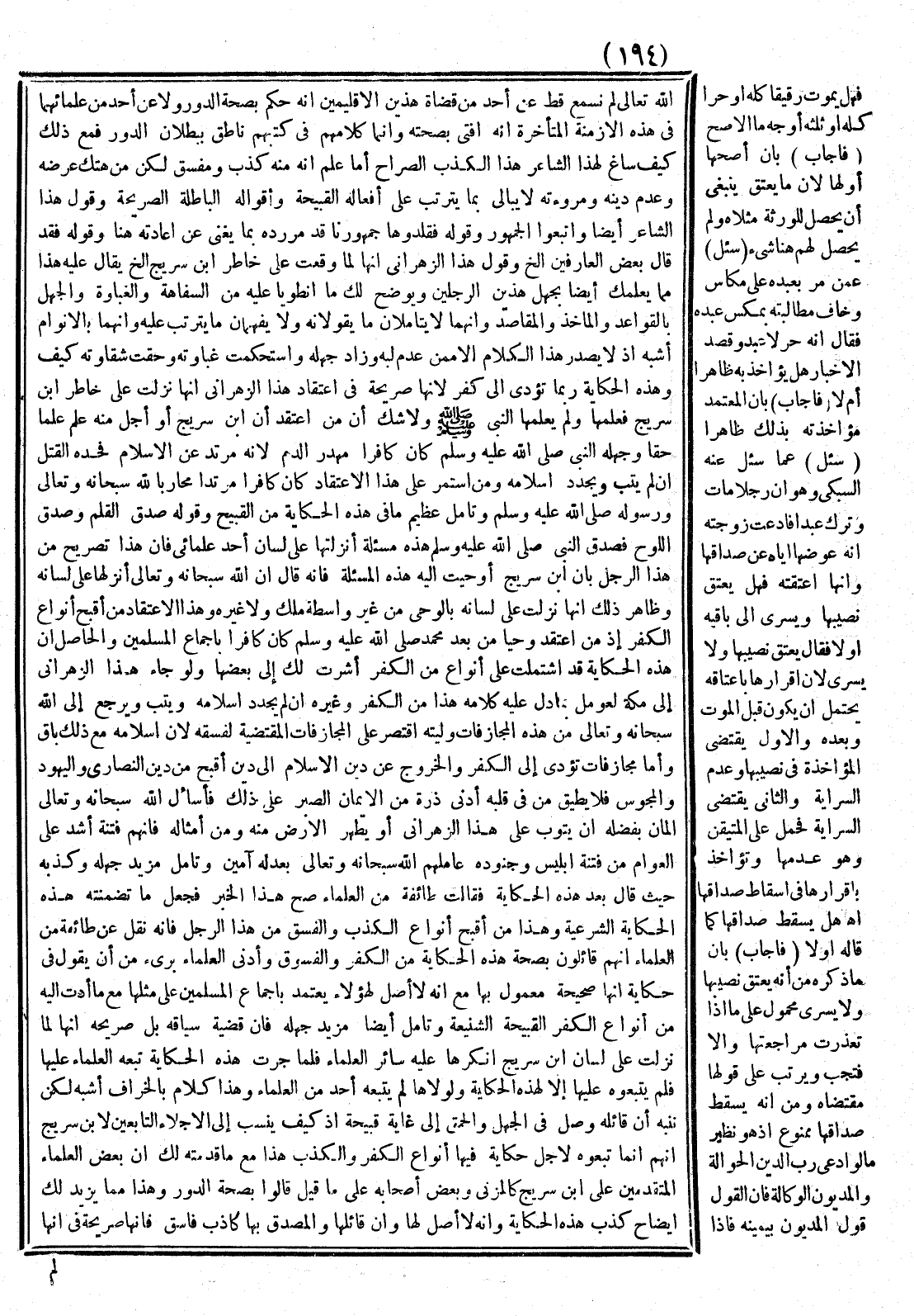 وَقَوْلُ هَذَا الزَّهْرَانِيِّ: إنَّهَا لَمَّا وَقَعَتْ عَلَى خَاطِرِ ابْنِ سُرَيْجٍ. . . إلَخْ يُقَالُ عَلَيْهِ هَذَا مِمَّا يُعْلِمُك أَيْضًا بِجَهْلِ هَذَيْنِ الرَّجُلَيْنِ وَيُوَضِّحُ لَك مَا انْطَوَيَا عَلَيْهِ مِنْ السَّفَاهَةِ وَالْغَبَاوَةِ وَالْجَهْلِ بِالْقَوَاعِدِ وَالْمَآخِذِ وَالْمَقَاصِدِ وَأَنَّهُمَا لَا يَتَأَمَّلَانِ مَا يَقُولَانِهِ وَلَا يَفْهَمَانِ مَا يَتَرَتَّبُ عَلَيْهِ وَأَنَّهُمَا بِالْأَنْوَامِ أَشْبَهُ، إذْ لَا يَصْدُرُ هَذَا الْكَلَامُ إلَّا مِمَّنْ عَدِمَ لُبَّهُ وَزَادَ جَهْلُهُ وَاسْتَحْكَمَتْ غَبَاوَتُهُ وَحَقَّتْ شَقَاوَتُهُ، كَيْفَ وَهَذِهِ الْحِكَايَةُ رُبَّمَا تُؤَدِّي إلَى كُفْرٍ؛ لِأَنَّهَا صَرِيحَةٌ فِي اعْتِقَادِ هَذَا الزَّهْرَانِيِّ أَنَّهَا نَزَلَتْ عَلَى خَاطِرِ ابْنِ سُرَيْجٍ فَعَلِمَهَا وَلَمْ يَعْلَمْهَا النَّبِيُّ - صَلَّى اللَّهُ عَلَيْهِ وَسَلَّمَ - وَلَا شَكَّ أَنَّ مَنْ اعْتَقَدَ أَنَّ ابْنَ سُرَيْجٍ، أَوْ أَجَلَّ مِنْهُ عَلِمَ عِلْمًا حَقًّا وَجَهِلَهُ النَّبِيُّ - صَلَّى اللَّهُ عَلَيْهِ وَسَلَّمَ - كَانَ كَافِرًا مُهْدَرَ الدَّمِ؛ لِأَنَّهُ مُرْتَدٌّ عَنْ الْإِسْلَامِ فَحَدُّهُ الْقَتْلُ إنْ لَمْ يَتُبْ وَيُجَدِّدْ إسْلَامَهُ وَمَنْ اسْتَمَرَّ عَلَى هَذَا الِاعْتِقَادِ كَانَ كَافِرًا مُرْتَدًّا مُحَارِبًا لِلَّهِ سُبْحَانَهُ وَتَعَالَى وَرَسُولِهِ - صَلَّى اللَّهُ عَلَيْهِ وَسَلَّمَ - وَتَأَمَّلْ عَظِيمَ مَا فِي هَذِهِ الْحِكَايَةِ مِنْ الْقَبِيحِ، وَقَوْلُهُ صَدَقَ الْقَلَمُ وَصَدَقَ اللَّوْحُ فَصَدَقَ النَّبِيُّ - صَلَّى اللَّهُ عَلَيْهِ وَسَلَّمَ - هَذِهِ مَسْأَلَةٌ أَنْزَلْتهَا عَلَى لِسَانِ أَحَدِ عُلَمَائِي فَإِنَّ هَذَا تَصْرِيحٌ مِنْ هَذَا الرَّجُلِ بِأَنَّ ابْنَ سُرَيْجٍ أُوحِيَتْ إلَيْهِ هَذِهِ الْمَسْأَلَةُ فَإِنَّهُ قَالَ: إنَّ اللَّهَ سُبْحَانَهُ وَتَعَالَى أَنْزَلَهَا عَلَى لِسَانِهِ وَظَاهِرُ ذَلِكَ أَنَّهَا نَزَلَتْ عَلَى لِسَانِهِ بِالْوَحْيِ مِنْ غَيْرِ وَاسِطَةِ مَلَكٍ وَلَا غَيْرِهِ وَهَذَا الِاعْتِقَادُ مِنْ أَقْبَحِ أَنْوَاعِ الْكُفْرِ إذْ مَنْ اعْتَقَدَ وَحْيًا مِنْ بَعْدِ مُحَمَّدٍ - صَلَّى اللَّهُ عَلَيْهِ وَسَلَّمَ - كَانَ كَافِرًا بِإِجْمَاعِ الْمُسْلِمِينَ، وَالْحَاصِلُ أَنَّ هَذِهِ الْحِكَايَةَ قَدْ اشْتَمَلَتْ عَلَى أَنْوَاعٍ مِنْ الْكُفْرِ أَشَرْت لَك إلَى بَعْضِهَا وَلَوْ جَاءَ هَذَا الزَّهْرَانِيُّ إلَى مَكَّةَ لَعُومِلَ بِمَا دَلَّ عَلَيْهِ كَلَامُهُ هَذَا مِنْ الْكُفْرِ وَغَيْرِهِ إنْ لَمْ يُجَدِّدْ إسْلَامَهُ وَيَتُبْ وَيَرْجِعْ إلَى اللَّهِ سُبْحَانَهُ وَتَعَالَى مِنْ هَذِهِ الْمُجَازَفَاتِ وَلَيْتَهُ اقْتَصَرَ عَلَى الْمُجَازَفَاتِ الْمُقْتَضِيَةِ لِفِسْقِهِ؛ لِأَنَّ إسْلَامَهُ مَعَ ذَلِكَ بَاقٍ وَأَمَّا مُجَازَفَاتٌ تُؤَدِّي إلَى الْكُفْرِ وَالْخُرُوجِ عَنْ دِينِ الْإِسْلَامِ إلَى دِينٍ أَقْبَحَ مِنْ دِينِ النَّصَارَى وَالْيَهُودِ وَالْمَجُوس فَلَا يُطِيقُ مَنْ فِي قَلْبِهِ أَدْنَى ذَرَّةٍ مِنْ الْإِيمَانِ الصَّبْرَ عَلَى ذَلِكَ فَأَسْأَلُ اللَّهَ سُبْحَانَهُ وَتَعَالَى الْمَنَّانَ بِفَضْلِهِ أَنْ يَتُوبَ عَلَى هَذَا الزَّهْرَانِيِّ، أَوْ يُطَهِّرَ الْأَرْضَ مِنْهُ وَمِنْ أَمْثَالِهِ فَإِنَّهُمْ فِتْنَةٌ أَشَدُّ عَلَى الْعَوَامّ مِنْ فِتْنَةِ إبْلِيسٍ وَجُنُودِهِ عَامَلَهُمْ اللَّهُ سُبْحَانَهُ وَتَعَالَى بِعَدْلِهِ - آمِينَ.
