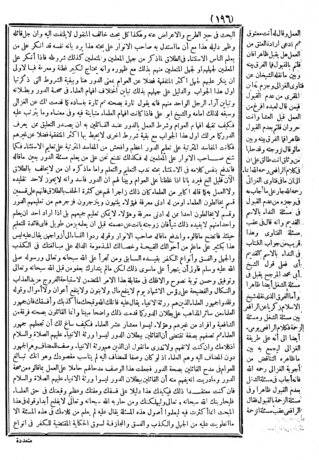 الْبَحْثُ فِي حَيِّزِ الطَّرْحِ وَالْإِعْرَاضِ عَنْهُ، وَهَكَذَا كُلُّ بَحْثٍ خَالَفَ الْمَنْقُولَ لَا يُلْتَفَتُ إلَيْهِ وَإِنْ جَلَّ قَائِلُهُ وَظَهَرَ دَلِيلُهُ هَذَا مَعَ أَنَّ مَا اسْتَدَلَّ بِهِ صَاحِبُ الْأَنْوَارِ عَلَى بَحْثِهِ هَذَا يُرَدُّ بِأَنَّهُ نَفْسَهُ قَدْ أَنْكَرَ عَلَى مَنْ يُعَلِّمُ النَّاسَ الِاسْتِثْنَاءَ فِي الطَّلَاقِ لِمَا ذَكَرَ مِنْ جَهْلِ الْمُعَلِّمِينَ وَالْمُتَعَلِّمِينَ كَذَلِكَ شُرُوطَهُ فَإِذَا أَنْكَرَ عَلَى الْمُعَلِّمِينَ لِجَهْلِهِمْ، أَوْ لِجَهْلِ الْمُتَعَلِّمِينَ مِنْهُمْ بِذَلِكَ مَعَ ظُهُورِهِ وَأَنَّهُ يَحْتَاجُ لِكَبِيرِ فِطْنَةٍ وَمَعْرِفَةٍ فَبِالْأَوْلَى أَنْ يُنْكِرَ عَلَيْهِمْ لِجَهْلِ أَكْثَرِ الْمُتَفَقِّهَةِ فَضْلًا عَنْ الْعَوَامّ بِمَعْنَى الدَّوْرِ هُنَا وَبِبَقِيَّةِ الشُّرُوطِ الَّتِي ذَكَرْتهَا أَوَّلَ هَذَا الْجَوَابِ، وَالدَّلِيلُ عَلَى جَهْلِهِمْ بِذَلِكَ تَبَايُنُ اخْتِلَافِ أَفْهَامِ الْعُلَمَاءِ فِي صِحَّةِ الدَّوْرِ وَبُطْلَانِهِ وَتَبَايُنُ آرَاءِ الرَّجُلِ الْوَاحِدِ مِنْهُمْ