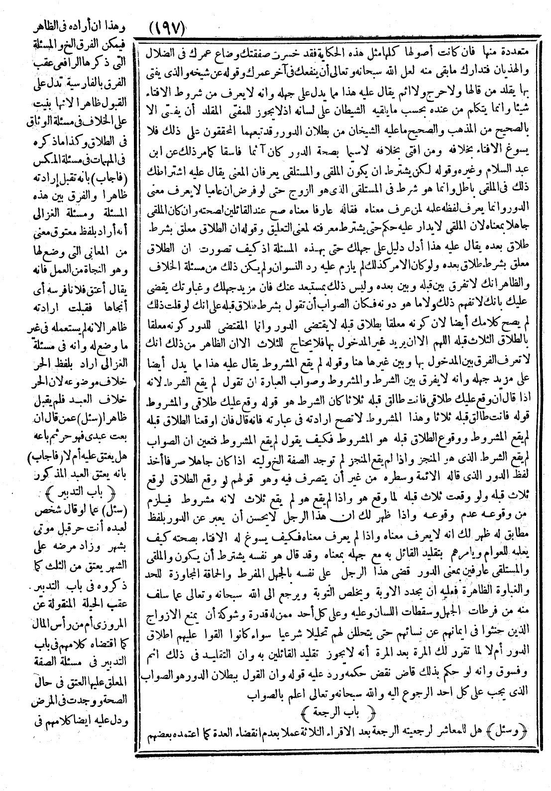 مُتَعَدِّدَةٍ مِنْهَا فَإِنْ كَانَتْ أُصُولُهَا كُلُّهَا مِثْلَ هَذِهِ الْحِكَايَةِ فَقَدْ خَسِرْت صَفْقَتَك وَضَاعَ عُمُرُك فِي الضَّلَالِ وَالْهَذَيَانِ فَتَدَارَكْ مَا بَقِيَ مِنْهُ لَعَلَّ اللَّهَ سُبْحَانَهُ وَتَعَالَى أَنْ يَنْفَعَك فِي آخِرِ عُمُرِك، وَقَوْلُهُ عَنْ شَيْخِهِ وَاَلَّذِي يُفْتِي بِهَا يُقَلِّدُ مَنْ قَالَهَا وَلَا جَرْحَ وَلَا إثْمَ يُقَالُ عَلَيْهِ هَذَا مِمَّا يَدُلُّ عَلَى جَهْلِهِ وَأَنَّهُ لَا يَعْرِفُ مِنْ شُرُوطِ الْإِفْتَاءِ شَيْئًا وَإِنَّمَا يَتَكَلَّمُ مِنْ عِنْدِهِ بِحَسَبِ مَا يُلْقِيهِ الشَّيْطَانُ عَلَى لِسَانِهِ إذْ لَا يَجُوزُ لِلْمُفْتِي الْمُقَلِّدِ أَنْ يُفْتِيَ إلَّا بِالصَّحِيحِ مِنْ الْمَذْهَبِ وَالصَّحِيحُ مَا عَلَيْهِ الشَّيْخَانِ مِنْ بُطْلَانِ الدَّوْرِ وَقَدْ تَبِعَهُمَا الْمُحَقِّقُونَ عَلَى ذَلِكَ فَلَا يَسُوغُ الْإِفْتَاءُ بِخِلَافِهِ وَمَنْ أَفْتَى بِخِلَافِهِ - لَا سِيَّمَا بِصِحَّةِ الدَّوْرِ - كَانَ آثِمًا فَاسِقًا كَمَا مَرَّ ذَلِكَ عَنْ ابْنِ عَبْدِ السَّلَامِ وَغَيْرِهِ، وَقَوْلُهُ: لَكِنْ يُشْتَرَطُ أَنْ يَكُونَ الْمُلْقِي وَالْمُسْتَلْقِي يَعْرِفَانِ الْمَعْنَى يُقَالُ عَلَيْهِ اشْتِرَاطُكَ ذَلِكَ فِي الْمُلْقِي بَاطِلٌ وَإِنَّمَا هُوَ شَرْطٌ فِي الْمُسْتَلْقِي الَّذِي هُوَ الزَّوْجُ حَتَّى لَوْ فُرِضَ أَنَّ عَامِّيًّا لَا يَعْرِفُ مَعْنَى الدَّوْرِ