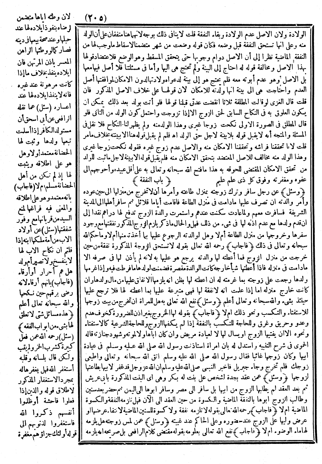 (فَأَجَابَ) - رَحِمَهُ اللَّهُ تَعَالَى - بِقَوْلِهِ لَا تَلْزَمهُ نَفَقَةٌ وَلَا كِسْوَةٌ لِلسِّنِينَ الْمَاضِيَةِ لِانْتِفَاءِ عِرْضِهَا، أَوْ عِرْضِ وَلِيِّهَا عَلَى الزَّوْجِ عِنْدَ حُضُورِهِ وَعَلَى الْحَاكِمِ عِنْدَ غَيْبَتِهِ.