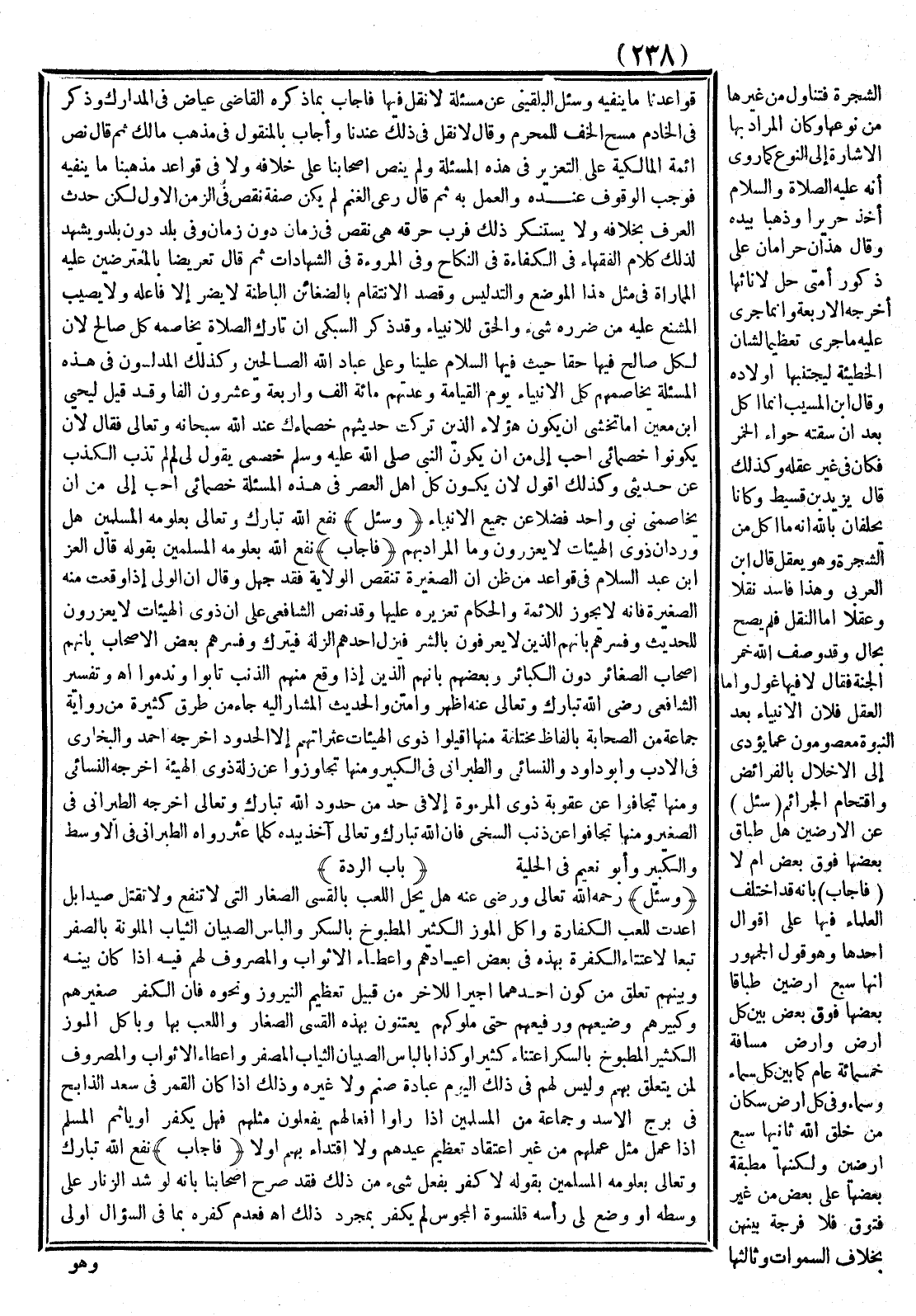 قَوَاعِدِنَا مَا يَنْفِيهِ وَسُئِلَ الْبُلْقِينِيُّ عَنْ مَسْأَلَةٍ لَا نَقْلَ فِيهَا فَأَجَابَ بِمَا ذَكَرَهُ الْقَاضِي عِيَاضٌ فِي الْمَدَارِكِ وَذَكَرَ فِي الْخَادِمِ مَسْحَ الْخُفِّ لِلْمُحْرِمِ وَقَالَ لَا نَقْلَ فِي ذَلِكَ عِنْدَنَا وَأَجَابَ بِالْمَنْقُولِ فِي مَذْهَبِ مَالِكٍ ثُمَّ قَالَ نَصَّ أَئِمَّةُ الْمَالِكِيَّةِ عَلَى التَّعْزِيرِ فِي هَذِهِ الْمَسْأَلَةِ وَلَمْ يَنُصَّ أَصْحَابُنَا عَلَى خِلَافِهِ وَلَا فِي قَوَاعِدِ مَذْهَبِنَا مَا يَنْفِيهِ فَوَجَبَ الْوُقُوفُ عِنْدَهُ وَالْعَمَلُ بِهِ ثُمَّ قَالَ رَعْيُ الْغَنَمِ لَمْ يَكُنْ صِفَةَ نَقْصٍ فِي الزَّمَنِ الْأَوَّلِ لَكِنْ حَدَثَ الْعُرْفُ بِخِلَافِهِ.