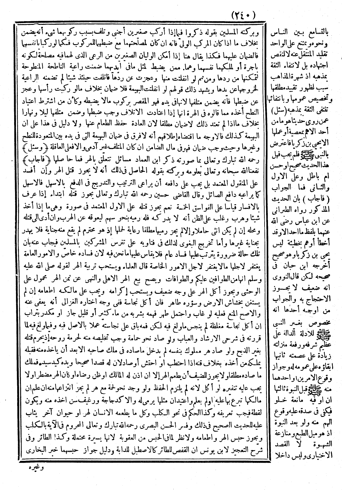 (فَأَجَابَ) نَفَعَنَا اللَّهُ سُبْحَانَهُ وَتَعَالَى بِعُلُومِهِ وَبَرَكَتِهِ بِقَوْلِهِ الْحَاصِلُ فِي ذَلِكَ أَنَّهُ لَا يَجُوزُ قَتْلُ الْهِرِّ وَإِنْ أَفْسَدَ عَلَى الْمَنْقُولِ الْمُعْتَمَدِ بَلْ يَجِبُ عَلَى دَافِعِهِ أَنْ يُرَاعِي التَّرْتِيبَ وَالتَّدْرِيجَ فِي الدَّفْعِ بِالْأَسْهَلِ فَالْأَسْهَلِ كَمَا يُرَاعِيهِ دَافِعُ الصَّائِلِ وَقَالَ الْقَاضِي حُسَيْنٌ رَحِمَهُ اللَّهُ تَبَارَكَ وَتَعَالَى يَجُوزُ قَتْلُهُ ابْتِدَاءً إذَا عُرِفَ بِالْإِفْسَادِ قِيَاسًا عَلَى الْفَوَاسِقِ الْخَمْسَةِ نَعَمْ يَجُوزُ قَتْلُهُ عَلَى الْأَوَّلِ الْمُعْتَمَدِ فِي صُورَةٍ وَهِيَ مَا إذَا أَخَذَ شَيْئًا وَهَرَبَ وَغَلَبَ عَلَى الظَّنِّ أَنَّهُ لَا يُدْرِكُهُ فَلَهُ رَمْيُهُ بِنَحْوِ سَهْمٍ لِيَعُوقَهُ عَنْ الْهَرَبِ.