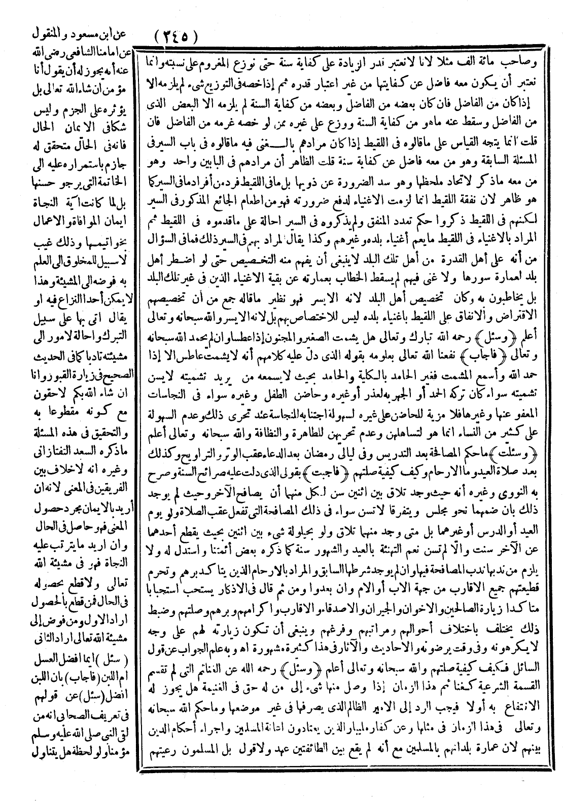 فَإِنْ قُلْت إنَّمَا يَتَّجِهُ الْقِيَاسُ عَلَى مَا قَالُوهُ فِي اللَّقِيطِ إذَا كَانَ مُرَادُهُمْ بِالْغِنَى فِيهِ مَا قَالُوهُ فِي بَابِ السِّيَرِ فِي الْمَسْأَلَةِ السَّابِقَةِ وَهُوَ مَنْ مَعَهُ فَاضِلٌ عَنْ كِفَايَةِ سَنَةٍ قُلْت الظَّاهِرُ أَنَّ مُرَادَهُمْ فِي الْبَابَيْنِ وَاحِدٌ وَهُوَ مَنْ مَعَهُ مَا ذَكَرَ لِاتِّحَادِ مَلْحَظِهِمَا وَهُوَ سَدُّ الضَّرُورَةِ عَنْ ذَوِيهَا بَلْ مَا فِي اللَّقِيطِ فَرْدٌ مِنْ أَفْرَادِ مَا فِي السِّيَرِ كَمَا هُوَ ظَاهِرٌ لِأَنَّ نَفَقَةَ اللَّقِيطِ إنَّمَا لَزِمَتْ الْأَغْنِيَاءَ لِدَفْعِ ضَرُورَتِهِ فَهُوَ مِنْ إطْعَامِ الْجَائِعِ الْمَذْكُورِ فِي السِّيَرِ لَكِنَّهُمْ فِي اللَّقِيطِ ذَكَرُوا حُكْمَ تَعَدُّدِ الْمُنْفِقِ وَلَمْ يَذْكُرُوهُ فِي السِّيَرِ إحَالَةً عَلَى مَا قَدَّمُوهُ فِي اللَّقِيطِ ثُمَّ الْمُرَادُ بِالْأَغْنِيَاءِ فِي اللَّقِيطِ مَا يَعُمُّ أَغْنِيَاءَ بَلَدِهِ وَغَيْرَهُمْ وَكَذَا يُقَالُ الْمُرَادُ بِهِمْ فِي السِّيَرِ ذَلِكَ فَمَا فِي السُّؤَالِ مِنْ أَنَّهُ عَلَى أَهْلِ الْقُدْرَةِ مِنْ أَهْلِ تِلْكَ الْبَلَدِ لَا يَنْبَغِي أَنْ يُفْهَمَ مِنْهُ التَّخْصِيصُ حَتَّى لَوْ اُضْطُرَّ أَهْلُ بَلَدٍ لِعِمَارَةِ سُورِهَا وَلَا غَنِيَّ فِيهِمْ لَمْ يَسْقُطْ الْخِطَابُ بِعِمَارَتِهِ عَنْ بَقِيَّةِ الْأَغْنِيَاءِ الَّذِينَ فِي غَيْرِ تِلْكَ الْبَلَدِ بَلْ يُخَاطَبُونَ بِهِ وَكَانَ تَخْصِيصُ أَهْلِ الْبَلَدِ لِأَنَّهُ الْأَيْسَرُ فَهُوَ نَظِيرُ مَا قَالَهُ جَمْعٌ مِنْ أَنَّ تَخْصِيصَهُمْ الِاقْتِرَاضَ وَالْإِنْفَاقَ إلَى اللَّقِيطِ بِأَغْنِيَاءِ بَلَدِهِ لَيْسَ لِلِاخْتِصَاصِ بِهِمْ بَلْ لِأَنَّهُ الْأَيْسَرُ، وَاَللَّهُ سُبْحَانَهُ وَتَعَالَى أَعْلَمُ.