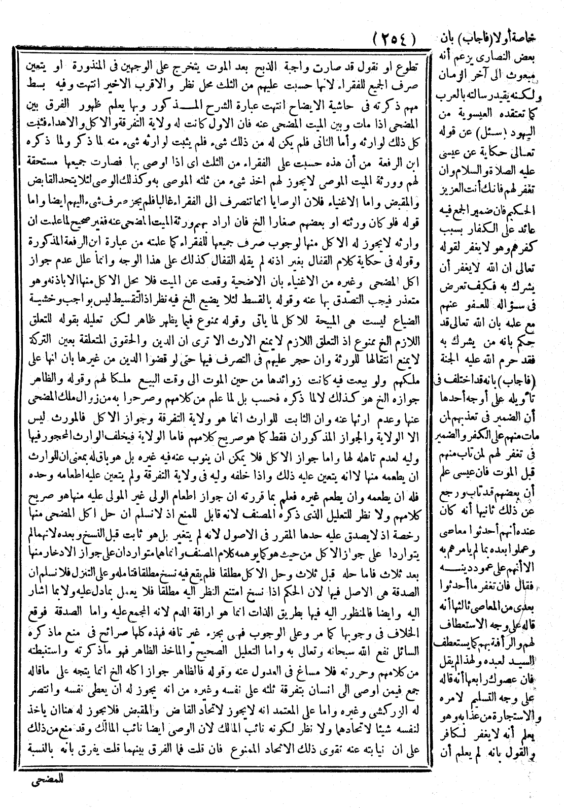 وَأَمَّا الصَّدَقَةُ فَوَقَعَ الْخِلَافُ فِي وُجُوبِهَا كَمَا مَرَّ وَعَلَى الْوُجُوبِ فَهِيَ بِجُزْءٍ غَيْرِ تَافِهٍ فَهَذِهِ كُلُّهَا صَرَائِحُ فِي مَنْعِ مَا ذَكَرَهُ السَّائِلُ نَفَعَ اللَّهُ سُبْحَانَهُ وَتَعَالَى بِهِ وَأَمَّا التَّعْلِيلُ الصَّحِيحُ وَالْمَأْخَذُ الظَّاهِرُ فَهُوَ مَا ذَكَرْته وَاسْتَنْبَطْتُهُ مِنْ كَلَامِهِمْ وَحَرَّرْته فَلَا مَسَاغَ فِي الْعُدُولِ عَنْهُ وَقَوْلُهُ فَالظَّاهِرُ جَوَازُ أَكْلِهِ إلَخْ إنَّمَا يَتَّجِهُ عَلَى مَا قَالَهُ جَمْعٌ فِيمَنْ أَوْصَى إلَى إنْسَانٍ بِتَفْرِقَةِ ثُلُثِهِ عَلَى نَفْسِهِ وَغَيْرِهِ مِنْ أَنَّهُ يَجُوزُ لَهُ أَنْ يُعْطِيَ نَفْسَهُ وَانْتَصَرَ لَهُ الزَّرْكَشِيُّ وَغَيْرُهُ.