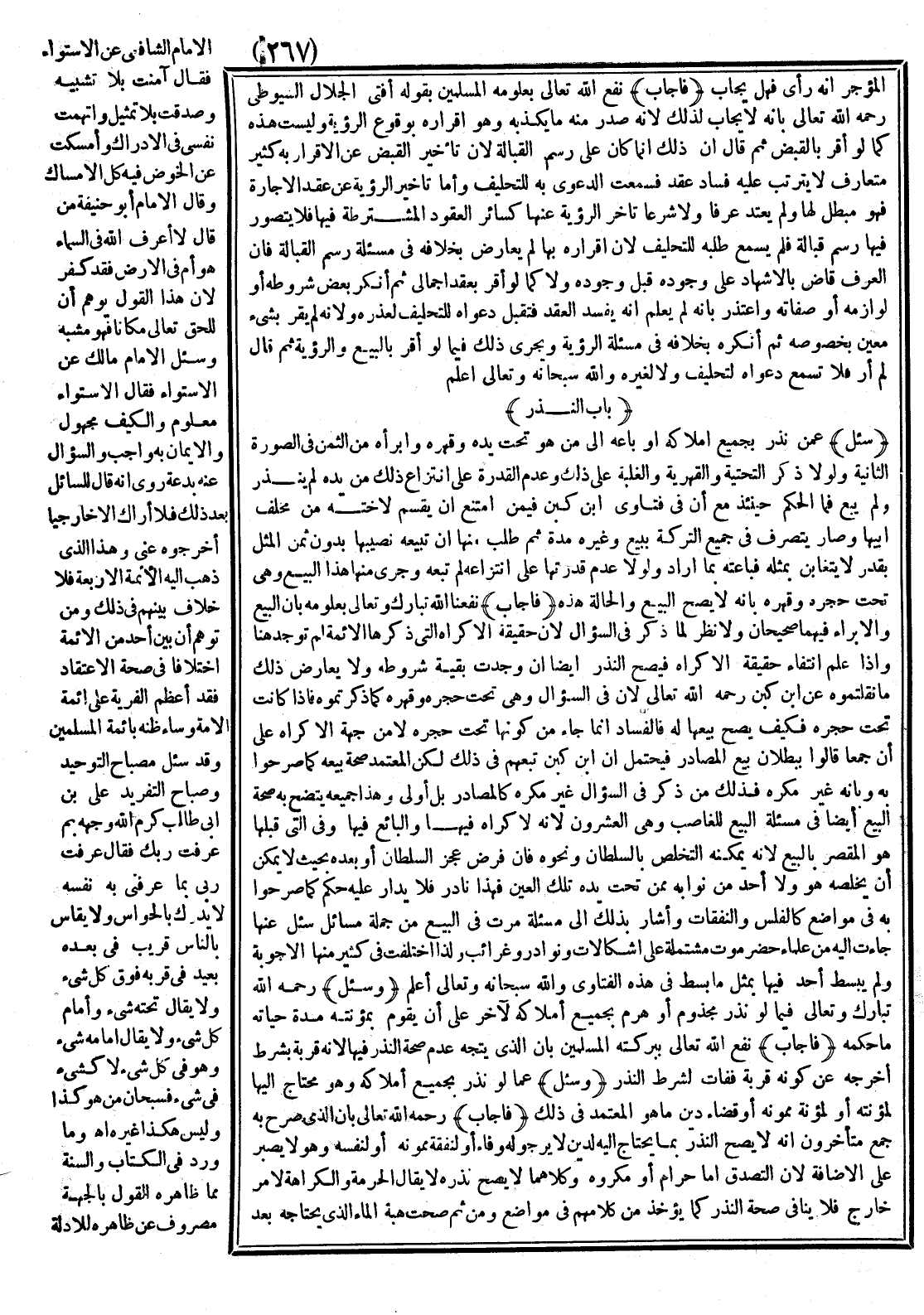 (فَأَجَابَ) نَفَعَنَا اللَّهُ تَبَارَكَ وَتَعَالَى بِعُلُومِهِ بِأَنَّ الْبَيْعَ وَالْإِبْرَاءَ فِيهِمَا صَحِيحَانِ وَلَا نَظَرَ لِمَا ذُكِرَ فِي السُّؤَالِ لِأَنَّ حَقِيقَةَ الْإِكْرَاهِ الَّتِي ذَكَرهَا الْأَئِمَّةُ لَمْ تُوجَدْ هُنَا وَإِذَا عُلِمَ انْتِفَاءُ حَقِيقَةِ الْإِكْرَاهِ فَيَصِحُّ النَّذْرُ أَيْضًا إنْ وُجِدَتْ بَقِيَّةُ شُرُوطِهِ وَلَا يُعَارِضُ ذَلِكَ مَا نَقَلْتُمُوهُ عَنْ ابْنِ كَبَّنَ - رَحِمَهُ اللَّهُ تَعَالَى - لِأَنَّ فِي السُّؤَالِ وَهِيَ تَحْتَ حَجْرِهِ وَقَهْرِهِ كَمَا ذَكَرْتُمُوهُ فَإِذَا كَانَتْ تَحْتَ حَجْرِهِ فَكَيْفَ يَصِحُّ بَيْعُهَا لَهُ فَالْفَسَادُ إنَّمَا جَاءَ مِنْ كَوْنِهَا تَحْتَ حَجْرِهِ لَا مِنْ جِهَةِ الْإِكْرَاهِ عَلَى أَنَّ جَمْعًا قَالُوا بِبُطْلَانِ بَيْعِ الْمُصَادِرِ فَيُحْتَمَلُ أَنَّ ابْنَ كَبَّنَ تَبِعَهُمْ فِي ذَلِكَ لَكِنَّ الْمُعْتَمَدَ صِحَّةُ بَيْعِهِ كَمَا صَرَّحُوا بِهِ وَبِأَنَّهُ غَيْرُ مُكْرَهٍ فَكَذَلِكَ مَنْ ذُكِرَ فِي السُّؤَالِ غَيْرُ مُكْرَهٍ كَالْمُصَادِرِ بَلْ أَوْلَى وَهَذَا جَمِيعُهُ يَتَّضِحُ بِهِ صِحَّةُ الْبَيْعِ أَيْضًا فِي مَسْأَلَةِ الْبَيْعِ لِلْغَاصِبِ وَهِيَ الْعِشْرُونَ لِأَنَّهُ لَا إكْرَاهَ فِيهَا وَالْبَائِعُ فِيهَا وَفِي الَّتِي قَبْلَهُ. اهـ. وَالْمُقَصِّرُ بِالْبَيْعِ لِأَنَّهُ يُمْكِنُهُ التَّخَلُّصُ بِالسُّلْطَانِ وَنَحْوِهِ فَإِنْ فُرِضَ عَجْزُ السُّلْطَانِ أَوْ بُعْدُهُ بِحَيْثُ لَا يُمْكِنُ أَنْ يُخَلِّصَهُ هُوَ وَلَا أَحَدٌ مِنْ نُوَّابِهِ مِمَّنْ تَحْتَ يَدِهِ تِلْكَ الْعَيْنُ فَهَذَا نَادِرٌ فَلَا يُدَارُ عَلَيْهِ حُكْمٌ كَمَا صَرَّحُوا بِهِ فِي مَوَاضِعَ كَالْفَلْسِ وَالنَّفَقَاتِ وَأَشَارَ بِذَلِكَ إلَى مَسْأَلَةٍ مَرَّتْ فِي الْبَيْعِ مِنْ جُمْلَةِ مَسَائِلَ سُئِلَ عَنْهَا جَاءَتْ إلَيْهِ مِنْ عُلَمَاءِ حَضْرَمَوْتَ مُشْتَمِلَةٌ عَلَى إشْكَالَاتٍ وَنَوَادِرَ وَغَرَائِبَ وَلِذَا اخْتَلَفَتْ فِي كَثِيرٍ مِنْهَا الْأَجْوِبَةُ وَلَمْ يَبْسُطْ أَحَدٌ فِيهَا بِمِثْلِ مَا بُسِطَ فِي هَذِهِ الْفَتَاوَى، وَاَللَّهُ سُبْحَانَهُ وَتَعَالَى أَعْلَمُ.