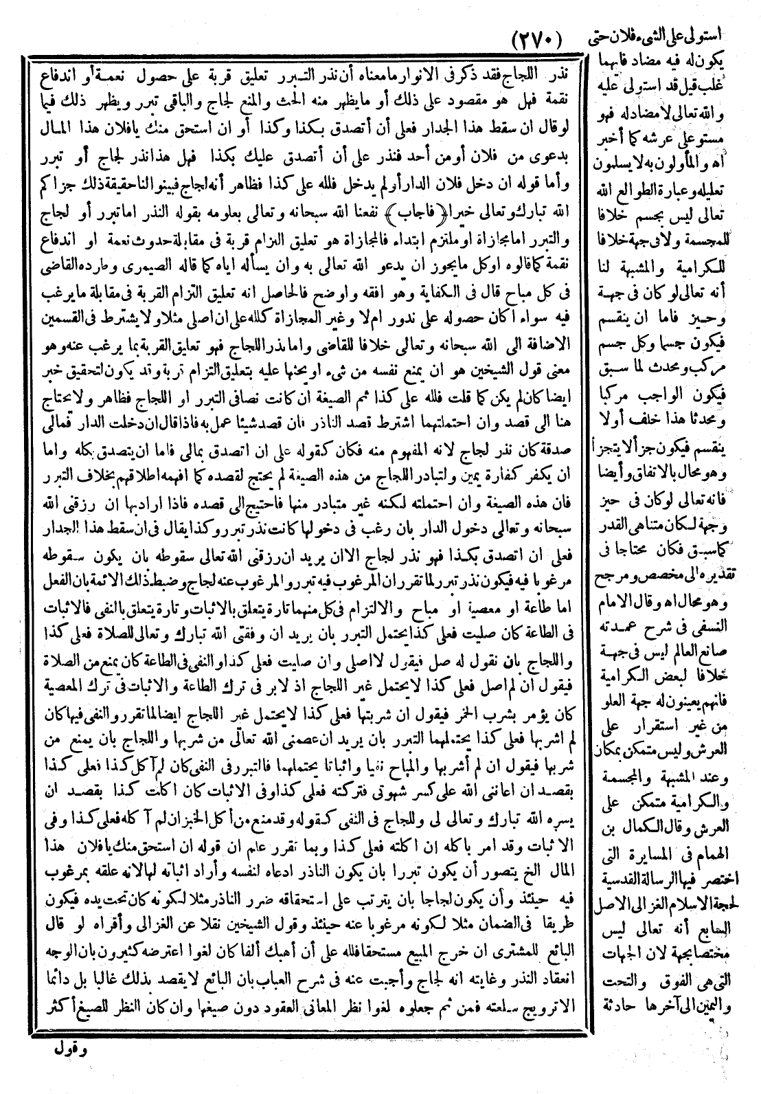 نَذْرِ اللَّجَاجِ فَقَدْ ذُكِرَ فِي الْأَنْوَارِ مَا مَعْنَاهُ أَنَّ نَذْرَ التَّبَرُّرِ تَعْلِيقُ قُرْبَةٍ عَلَى حُصُولِ نِعْمَةٍ أَوْ انْدِفَاعِ نِقْمَةٍ فَهَلْ هُوَ مَقْصُورٌ عَلَى ذَلِكَ أَوْ مَا يَظْهَرُ مِنْهُ الْحَثُّ وَالْمَنْعُ لَجَاجٌ وَالْبَاقِي تَبَرُّرٌ وَيَظْهَرُ ذَلِكَ فِيمَا لَوْ قَالَ إنْ سَقَطَ هَذَا الْجِدَارُ فَعَلَيَّ أَنْ أَتَصَدَّقَ بِكَذَا وَكَذَا أَوْ إنْ اُسْتُحِقَّ مِنْك يَا فُلَانُ هَذَا الْمَالَ بِدَعْوَى مِنْ فُلَانٍ أَوْ مِنْ أَحَدٍ فَنَذْرٌ عَلَيَّ أَنْ أَتَصَدَّقَ عَلَيْك بِكَذَا فَهَلْ هَذَا نَذْرُ لَجَاجٍ أَوْ تَبَرُّرٍ وَأَمَّا قَوْلُهُ إنْ دَخَلَ فُلَانٌ الدَّارَ أَوْ لَمْ يَدْخُلْ فَلِلَّهِ عَلَيَّ كَذَا فَظَاهِرُ أَنَّهُ لَجَاجٌ فَبَيِّنُوا لَنَا حَقِيقَةَ ذَلِكَ جَزَاكُمْ اللَّهُ تَبَارَكَ وَتَعَالَى خَيْرًا.