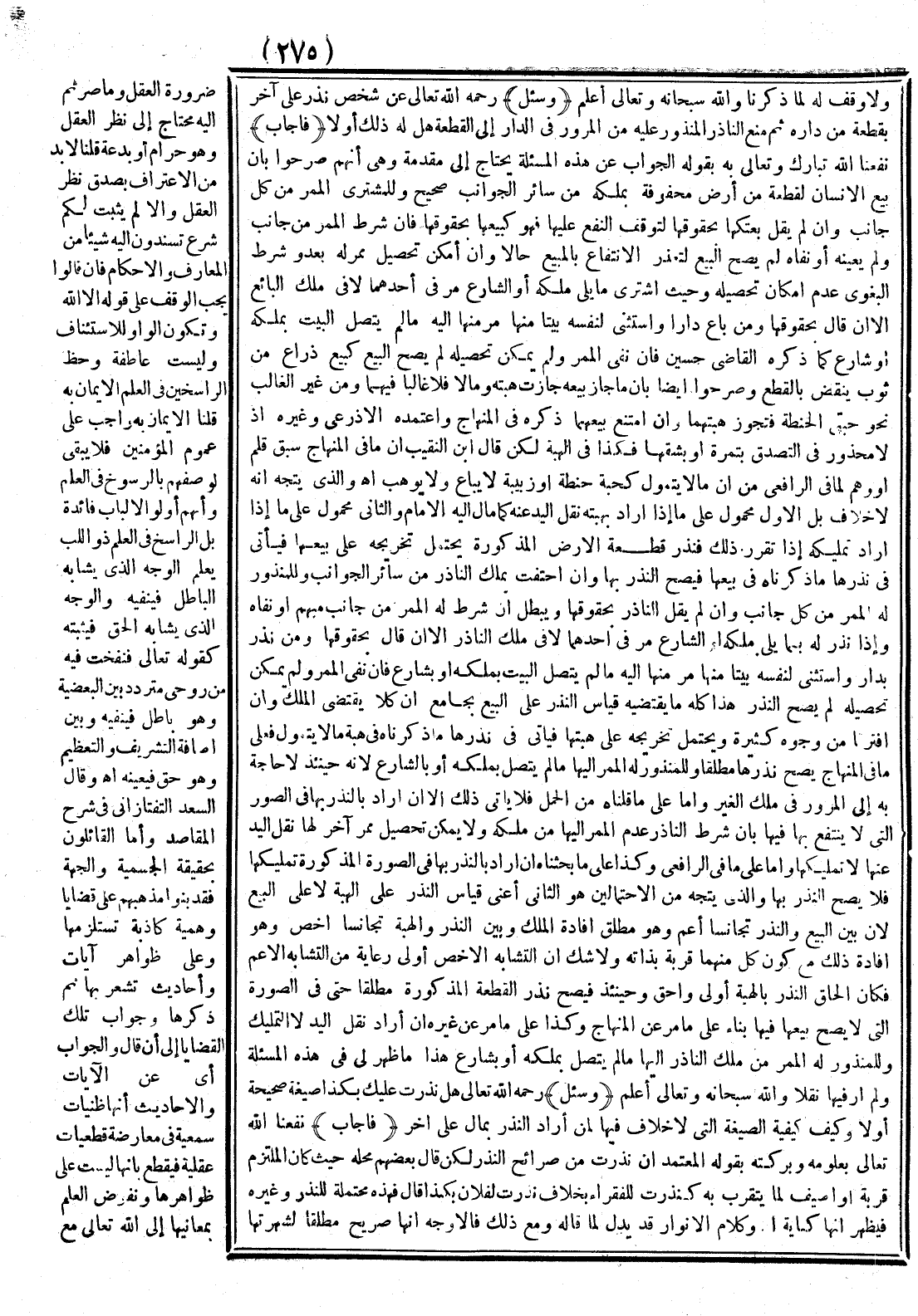 (فَأَجَابَ) نَفَعَنَا اللَّهُ تَبَارَكَ وَتَعَالَى بِهِ بِقَوْلِهِ الْجَوَابُ عَنْ هَذِهِ الْمَسْأَلَةِ يَحْتَاجُ إلَى مُقَدِّمَةٍ وَهِيَ أَنَّهُمْ صَرَّحُوا بِأَنَّ بَيْعَ الْإِنْسَانِ لِقِطْعَةٍ مِنْ أَرْضٍ مَحْفُوفَةٍ بِمِلْكِهِ مِنْ سَائِرِ الْجَوَانِبِ صَحِيحٌ وَلِلْمُشْتَرِي الْمَمَرُّ مِنْ كُلِّ جَانِبٍ وَإِنْ لَمْ يَقُلْ بِعْتُكَهَا بِحُقُوقِهَا لِتَوَقُّفِ النَّفْعِ عَلَيْهَا فَهُوَ كَبَيْعِهَا بِحُقُوقِهَا فَإِنْ شَرَطَ الْمَمَرَّ مِنْ جَانِبٍ وَلَمْ يُعَيِّنْهُ أَوَنَفَاهُ لَمْ يَصِحَّ الْبَيْعُ لِتَعَذُّرِ الِانْتِفَاعِ بِالْمَبِيعِ حَالًّا.