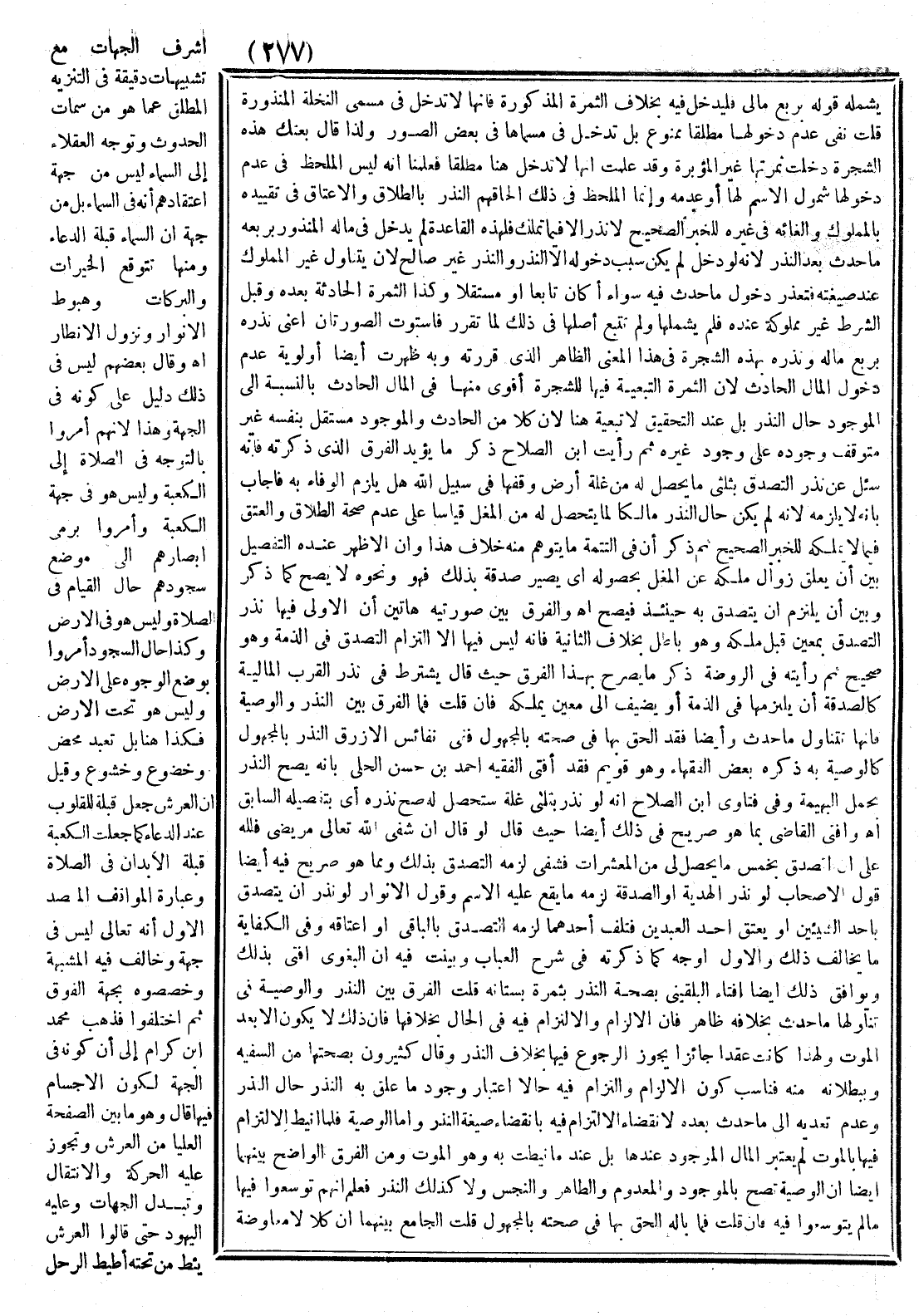 وَالْفَرْقُ بَيْنَ صُورَتَيْهِ هَاتَيْنِ أَنَّ الْأُولَى فِيهَا نَذْرُ التَّصَدُّقِ بِمُعَيَّنٍ قَبْلَ مِلْكِهِ وَهُوَ بَاطِلٌ بِخِلَافِ الثَّانِيَةِ فَإِنَّهُ لَيْسَ فِيهَا إلَّا الْتِزَامُ التَّصَدُّقُ فِي الذِّمَّةِ وَهُوَ صَحِيحٌ ثُمَّ رَأَيْته فِي الرَّوْضَةِ ذَكَرَ مَا يُصَرِّحُ بِهَذَا الْفَرْقِ حَيْثُ قَالَ يُشْتَرَطُ فِي نَذْرِ الْقُرْبِ الْمَالِيَّةُ كَالصَّدَقَةِ أَنْ يَلْتَزِمَهَا فِي الذِّمَّةِ أَوْ يُضِيفَ إلَى مُعَيَّنٍ يَمْلِكُهُ فَإِنْ قُلْت فَمَا الْفَرْقُ بَيْنَ النَّذْرِ وَالْوَصِيَّةِ فَإِنَّهَا تَتَنَاوَلُ مَا حَدَثَ وَأَيْضًا فَقَدْ أَلْحَقَ بِهَا فِي صِحَّتِهِ بِالْمَجْهُولِ فَفِي نَفَائِسِ الْأَزْرَقِ النَّذْرُ بِالْمَجْهُولِ كَالْوَصِيَّةِ بِهِ ذَكَرَهُ بَعْضُ الْفُقَهَاءِ وَهُوَ قَوِيمٌ فَقَدْ أَفْتَى الْفَقِيهُ أَحْمَدُ بْنُ حَسَنٍ الْحِلِّيُّ بِأَنَّهُ يَصِحُّ النَّذْرُ بِحِمْلِ الْبَهِيمَةِ وَفِي فَتَاوَى ابْنِ الصَّلَاحِ أَنَّهُ لَوْ نَذَرَ بِثُلُثَيْ غَلَّةٍ سَتَحْصُلُ لَهُ صَحَّ نَذْرُهُ أَيْ بِتَفْصِيلِهِ السَّابِقِ. اهـ. وَأَفْتَى الْقَاضِي بِمَا هُوَ صَرِيحٌ فِي ذَلِكَ أَيْضًا حَيْثُ قَالَ لَوْ قَالَ إنْ شَفَى اللَّهُ تَعَالَى مَرِيضِي فَلِلَّهِ عَلَيَّ أَنْ أَتَصَدَّقَ بِخُمُسِ مَا يَحْصُلُ لِي مِنْ الْمُعَشَّرَاتِ فَشُفِيَ لَزِمَهُ التَّصَدُّقُ بِذَلِكَ وَمِمَّا هُوَ صَرِيحٌ فِيهِ أَيْضًا قَوْلُ الْأَصْحَابِ لَهُ نَذْرُ الْهَدِيَّةِ أَوْ الصَّدَقَةِ لَزِمَهُ مَا يَقَعُ عَلَيْهِ الِاسْمُ وَقَوْلُ الْأَنْوَارِ لَوْ نَذَرَ أَنْ يَتَصَدَّقَ بِأَحَدِ الشَّيْئَيْنِ أَوْ يُعْتِقَ أَحَدَ الْعَبْدَيْنِ فَتَلِفَ أَحَدُهُمَا لَزِمَهُ التَّصَدُّقُ بِالْبَاقِي أَوْ إعْتَاقُهُ وَفِي الْكِفَايَةِ مَا يُخَالِفُ ذَلِكَ وَالْأَوَّلُ أَوْجَهُ كَمَا ذَكَرْته فِي شَرْحِ الْعُبَابِ وَبَيَّنْت فِيهِ أَنَّ الْبَغَوِيَّ أَفْتَى بِذَلِكَ وَيُوَافِقُ ذَلِكَ أَيْضًا إفْتَاءُ الْبُلْقِينِيُّ بِصِحَّةِ النَّذْرِ بِثَمَرَةِ بُسْتَانِهِ قُلْت الْفَرْقُ بَيْنَ النَّذْرِ وَالْوَصِيَّةِ فِي تَنَاوُلِهَا مَا حَدَثَ بِخِلَافِهِ ظَاهِرٌ فَإِنَّ الْإِلْزَامَ وَالِالْتِزَامَ فِيهِ فِي الْحَالِ بِخِلَافِهَا فَإِنَّ ذَلِكَ لَا يَكُونُ إلَّا بَعْدَ الْمَوْتِ وَلِهَذَا كَانَتْ عَقْدًا جَائِزًا يَجُوزُ الرُّجُوعُ فِيهَا بِخِلَافِ النَّذْرِ وَقَالَ كَثِيرُونَ بِصِحَّتِهَا مِنْ السَّفِيهِ وَبِبُطْلَانِهِ مِنْهُ فَنَاسَبَ كَوْنَ الْإِلْزَامِ وَالِالْتِزَامِ فِيهِ حَالًّا اعْتِبَارُ وُجُودِ مَا عَلَّقَ النَّذْرَ بِهِ حَالَ النَّذْرِ وَعَدَمِ تَعَدِّيهِ إلَى مَا حَدَثَ بَعْدَهُ لِانْقِضَاءِ الِالْتِزَامِ فِيهِ بِانْقِضَاءِ صِيغَةِ النَّذْرِ