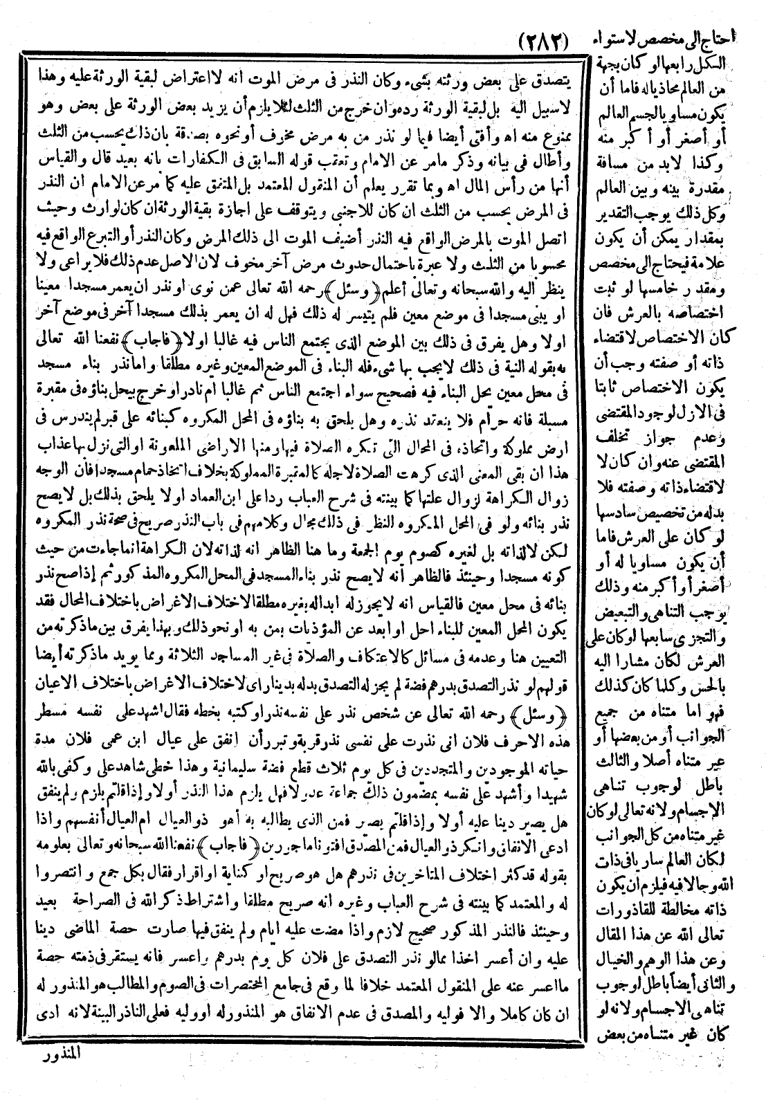 يَتَصَدَّقَ عَلَى بَعْضِ وَرَثَتِهِ بِشَيْءٍ وَكَانَ النَّذْرُ فِي مَرَضِ الْمَوْتِ أَنَّهُ لَا اعْتِرَاضَ لِبَقِيَّةِ الْوَرَثَةِ عَلَيْهِ وَهَذَا لَا سَبِيلَ إلَيْهِ بَلْ لِبَقِيَّةِ الْوَرَثَةِ رَدُّهُ وَإِنْ خَرَجَ مِنْ الثُّلُثِ لِئَلَّا يَلْزَمَ أَنْ يَزِيدَ بَعْضُ الْوَرَثَةِ عَلَى بَعْضٍ وَهُوَ مَمْنُوعٌ مِنْهُ. اهـ. وَأَفْتَى أَيْضًا فِيمَا لَوْ نَذَرَ مَنْ بِهِ مَرَضٌ مَخُوفٌ أَوْ نَحْوُهُ بِصَدَقَةٍ بِأَنَّ ذَلِكَ يُحْسَبُ مِنْ الثُّلُثِ وَأَطَالَ فِي بَيَانِهِ وَذَكَرَ مَا مَرَّ عَنْ الْإِمَامِ وَتُعُقِّبَ قَوْلُهُ السَّابِقُ فِي الْكَفَّارَاتِ بِأَنَّهُ بَعِيدٌ قَالَ وَالْقِيَاسُ أَنَّهَا مِنْ رَأْسِ الْمَالِ. اهـ. وَبِمَا تَقَرَّرَ أَنَّ الْمَنْقُولَ الْمُعْتَمَدَ بَلْ الْمُتَّفَقَ عَلَيْهِ كَمَا مَرَّ عَنْ الْإِمَامِ أَنَّ النَّذْرَ فِي الْمَرَضَ يُحْسَبُ مِنْ الثُّلُثِ إنْ كَانَ لِلْأَجْنَبِيِّ وَيَتَوَقَّفُ عَلَى إجَازَةِ بَقِيَّةِ الْوَرَثَةِ إنْ كَانَ لِوَارِثٍ وَحَيْثُ اتَّصَلَ الْمَوْتُ بِالْمَرَضِ الْوَاقِعِ فِيهِ النَّذْرُ أُضِيفَ الْمَوْتُ إلَى ذَلِكَ الْمَرَضِ وَكَانَ النَّذْرُ أَوْ التَّبَرُّعُ الْوَاقِعُ فِيهِ مَحْسُوبًا مِنْ الثُّلُثِ وَلَا عِبْرَةَ بِاحْتِمَالِ حُدُوثِ مَرَضٍ آخَرَ مَخُوفٍ لِأَنَّ الْأَصْلَ عَدَمُ ذَلِكَ فَلَا يُرَاعَى وَلَا يُنْظَرُ إلَيْهِ، وَاَللَّهُ سُبْحَانَهُ وَتَعَالَى أَعْلَمُ.