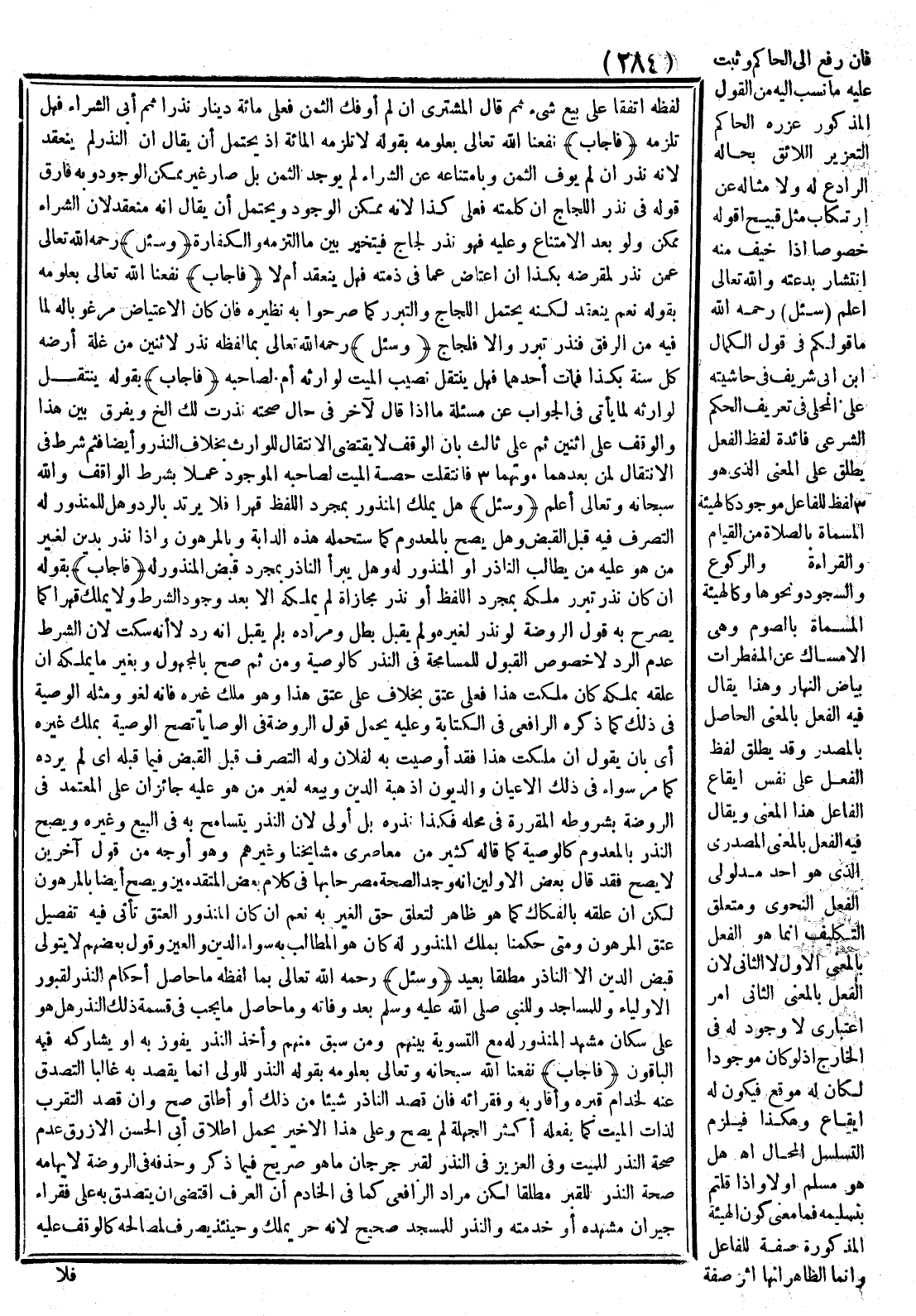(فَأَجَابَ) نَفَعَنَا اللَّهُ تَعَالَى بِعُلُومِهِ بِقَوْلِهِ لَا تَلْزَمُهُ الْمِائَةُ إذْ يُحْتَمَلُ أَنْ يُقَالَ إنَّ النَّذْرَ لَمْ يَنْعَقِدْ لِأَنَّهُ نَذَرَ إنْ لَمْ يُوَفِّ الثَّمَنَ وَبِامْتِنَاعِهِ عَنْ الشِّرَاءِ لَمْ يُوجَدْ الثَّمَنُ بَلْ صَارَ غَيْرَ مُمْكِنِ الْوُجُودِ وَبِهِ فَارَقَ قَوْلَهُ فِي نَذْرِ اللَّجَاجِ إنَّ كَلِمَتَهُ فَعَلَيَّ كَذَا لِأَنَّهُ مُمْكِنُ الْوُجُودِ وَيُحْتَمَلُ أَنْ يُقَالَ إنَّهُ مُنْعَقِدٌ لِأَنَّ الشِّرَاءَ مُمْكِنٌ وَلَوْ بَعْدَ الِامْتِنَاعِ وَعَلَيْهِ فَهُوَ نَذْرُ لَجَاجٍ فَيَتَخَيَّرُ بَيْنَ مَا الْتَزَمَهُ وَالْكَفَّارَةِ.