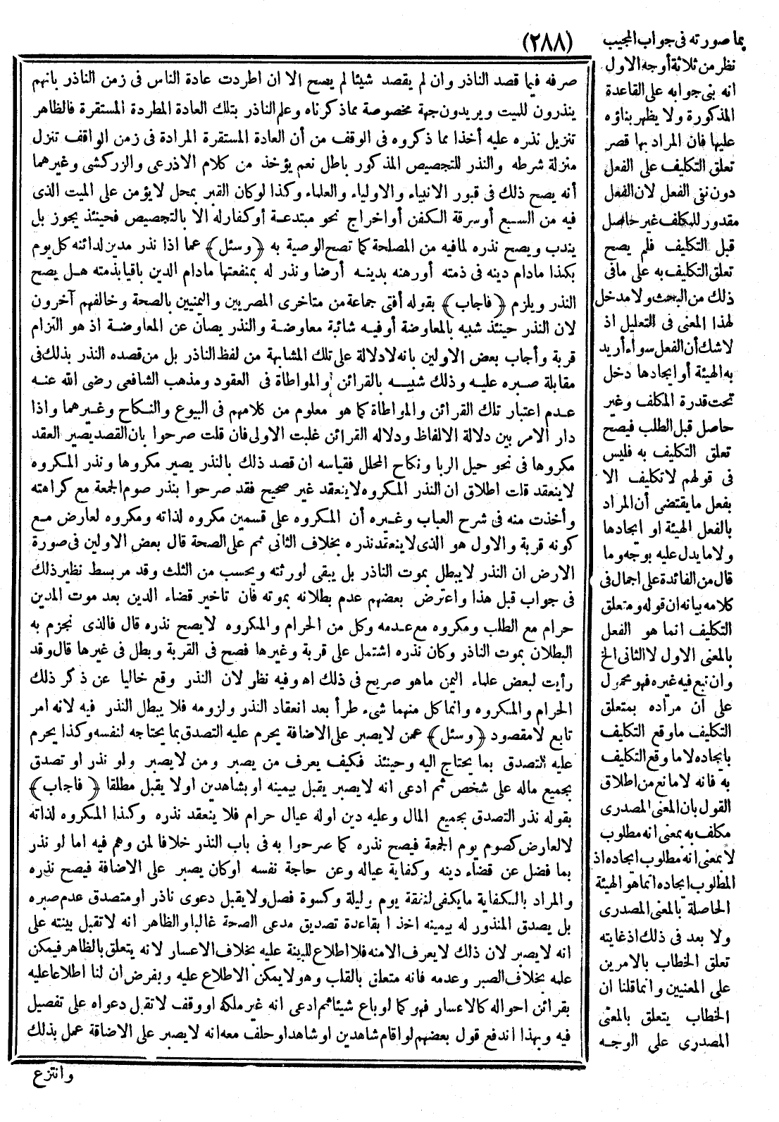(فَأَجَابَ) بِقَوْلِهِ نَذْرُ التَّصَدُّقِ بِجَمِيعِ الْمَالِ وَعَلَيْهِ دَيْنٌ أَوْ لَهُ عِيَالٌ حَرَامٌ فَلَا يَنْعَقِدُ نَذْرُهُ وَكَذَا الْمَكْرُوهُ لِذَاتِهِ لَا لِعَارِضٍ كَصَوْمِ يَوْمِ الْجُمُعَةِ فَيَصِحُّ نَذْرُهُ كَمَا صَرَّحُوا بِهِ فِي بَابِ النَّذْرِ خِلَافًا لِمَنْ وَهِمَ فِيهِ.