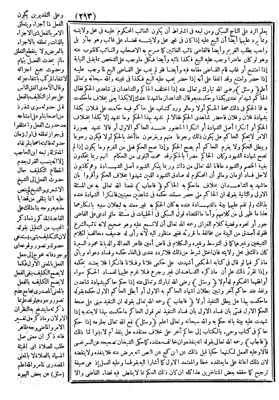 يُعْلَمُ الرَّدُّ عَلَى التَّاجِ السُّبْكِيّ وَمَنْ تَبِعَهُ فِي اشْتِرَاطِ أَنْ يَكُونَ الْغَائِبُ الْمَحْكُومُ عَلَيْهِ فِي مَحَلِّ وِلَايَتِهِ وَمِمَّا يَرِدُ عَلَيْهِمَا أَيْضًا أَنَّ الْبَيْعَ عَلَيْهِ إذَا كَانَ فِي غَيْرِ مَحَلِّ وِلَايَتِهِ قَضَاءً عَلَى غَائِبٍ وَهُوَ جَائِزٌ بَلْ وَاجِبٌ بِطَلَبِ الْغَرِيمِ وَأَيْضًا فَالْقَاضِي نَائِبُ الْغَائِبِينَ كَمَا صَرَّحَ بِهِ الْأَصْحَابُ وَالنَّائِبُ كَالْمَنُوبِ عَنْهُ وَهُوَ لَوْ كَانَ حَاضِرًا وَجَبَ عَلَيْهِ الْبَيْعُ فَكَذَا نَائِبُهُ وَأَيْضًا فَكُلُّ مَا وَجَبَ عَلَى الشَّخْصِ مِمَّا يَقْبَلُ النِّيَابَةَ إذَا امْتَنَعَ أَوْ غَابَ قَامَ الْقَاضِي مَقَامَهُ فِيهِ وَأَيْضًا فَلَوْ لَمْ يَجِبْ عَلَى الْقَاضِي الْبَيْعُ لَمَا وَجَبَ عَلَيْهِ إذَا حَضَرَ وَامْتَنَعَ وَقَدْ اتَّفَقَا عَلَى أَنَّهُ إذَا حَضَرَ يَجِبُ عَلَيْهِ الْبَيْعُ فَكَذَا فِي غَيْبَتِهِ، وَاَللَّهُ سُبْحَانَهُ وَتَعَالَى أَعْلَمُ.