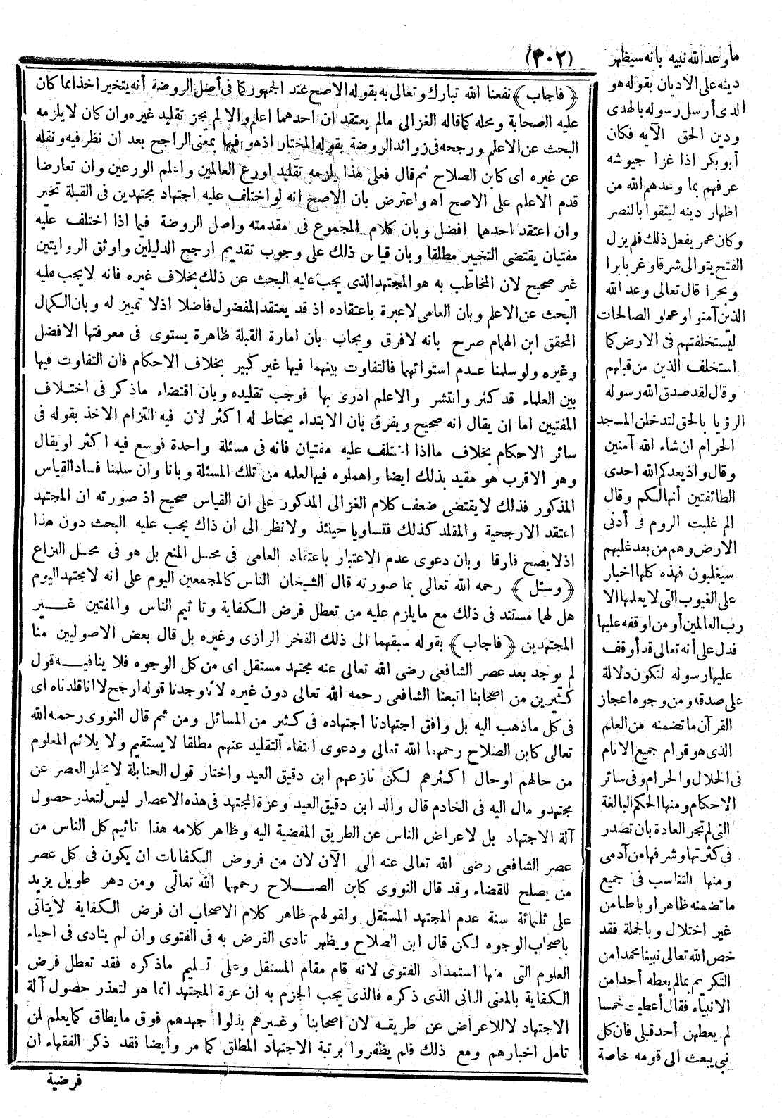 ثَمَّ قَالَ النَّوَوِيُّ - رَحِمَهُ اللَّهُ تَعَالَى - كَابْنِ الصَّلَاحِ رَحِمَهُمَا اللَّهُ تَعَالَى وَدَعْوَى انْتِفَاءِ التَّقْلِيدِ عَنْهُمْ مُطْلَقًا لَا يَسْتَقِيمُ وَلَا يُلَائِمُ الْمَعْلُومَ مِنْ حَالِهِمْ أَوْ حَالِ أَكْثَرِهِمْ لَكِنْ نَازَعَهُمْ ابْنُ دَقِيقِ الْعِيدِ وَاخْتَارَ قَوْلَ الْحَنَابِلَةِ لَا يَخْلُو الْعَصْرُ عَنْ مُجْتَهِدٍ وَمَالَ إلَيْهِ فِي الْخَادِمِ قَالَ وَالِدُ ابْنِ دَقِيقِ الْعِيدِ وَعِزَّةُ الْمُجْتَهِدِ فِي هَذِهِ الْأَعْصَارِ لَيْسَ لِتَعَذُّرِ حُصُولِ آلَةِ الِاجْتِهَادِ بَلْ لِإِعْرَاضِ النَّاسِ عَنْ الطَّرِيقِ الْمُفْضِيَةِ إلَيْهِ وَظَاهِرُ كَلَامِهِ هَذَا تَأْثِيمُ كُلِّ النَّاسِ مِنْ عَصْرِ الشَّافِعِيِّ - رَضِيَ اللَّهُ تَعَالَى عَنْهُ - إلَى الْآنَ لِأَنَّ مِنْ فُرُوضِ الْكِفَايَاتِ أَنْ يَكُونَ فِي كُلِّ عَصْرٍ مَنْ يَصْلُحُ لِلْقَضَاءِ وَقَدْ قَالَ النَّوَوِيُّ كَابْنِ الصَّلَاحِ رَحِمَهُمَا اللَّهُ تَعَالَى وَمِنْ دَهْرٍ طَوِيلٍ يَزِيدُ عَلَى ثَلَاثِمِائَةِ سَنَةٍ عُدِمَ الْمُجْتَهِدُ الْمُسْتَقِلُّ وَلِقَوْلِهِمْ ظَاهِرُ كَلَامِ الْأَصْحَابِ أَنَّ فَرْضَ الْكِفَايَةِ لَا يَتَأَتَّى بِأَصْحَابِ الْوُجُوهِ لَكِنْ قَالَ ابْنُ الصَّلَاحِ وَيَظْهَرُ تَأَدِّي الْفَرْضِ بِهِ فِي الْفَتْوَى وَإِنْ لَمْ يَتَأَدَّ فِي إحْيَاءِ الْعُلُومِ الَّتِي مِنْهَا اسْتِمْدَادُ الْفَتْوَى لِأَنَّهُ قَامَ مَقَامَ الْمُسْتَقِلِّ وَعَلَى تَسْلِيمِ مَا ذَكَرَهُ فَقَدْ تَعَطَّلَ فَرْضُ الْكِفَايَةِ بِالْمَعْنَى الثَّانِي الَّذِي ذَكَرَهُ فَاَلَّذِي يَجِبُ الْجَزْمُ بِهِ أَنَّ عِزَّةَ الْمُجْتَهِدِ إنَّمَا هُوَ لِتَعَذُّرِ حُصُولِ آلَةِ الِاجْتِهَادِ لَا لِلْإِعْرَاضِ عَنْ طَرِيقِهِ لِأَنَّ أَصْحَابَنَا وَغَيْرَهُمْ بَذَلُوا جُهْدَهُمْ فَوْقَ مَا يُطْلَقُ كَمَا يُعْلَمُ لِمَنْ تَأَمَّلَ أَخْبَارَهُمْ وَمَعَ ذَلِكَ فَلَمْ يَظْفَرُوا بِرُتْبَةِ الِاجْتِهَادِ الْمُطْلَقِ كَمَا مَرَّ وَأَيْضًا فَقَدْ ذَكَرَ الْفُقَهَاءُ أَنَّ