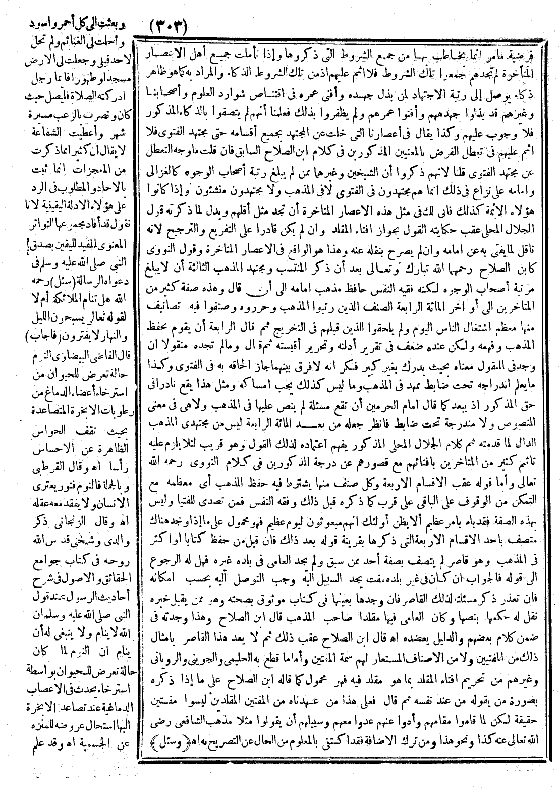 وَكَذَا يُقَالُ فِي أَعْصَارِنَا الَّتِي خَلَتْ عَنْ الْمُجْتَهِدِ بِجَمِيعِ أَقْسَامِهِ حَتَّى مُجْتَهِدِ الْفَتْوَى فَلَا إثْمَ عَلَيْهِمْ فِي تَعَطُّلِ الْفَرْضِ بِالْمَعْنَيَيْنِ الْمَذْكُورَيْنِ فِي كَلَامِ ابْنِ الصَّلَاحِ السَّابِقِ فَإِنْ قُلْت مَا وَجْهُ التَّعَطُّلِ عَنْ مُجْتَهِدِ الْفَتْوَى قُلْنَا لِأَنَّهُمْ ذَكَرُوا أَنَّ الشَّيْخَيْنِ وَغَيْرَهُمَا مِمَّنْ لَمْ يَبْلُغْ رُتْبَةُ أَصْحَابِ الْوُجُوهِ كَالْغَزَالِيِّ وَإِمَامِهِ عَلَى نِزَاعٍ فِي ذَلِكَ إنَّمَا هُمْ مُجْتَهِدُونَ فِي الْفَتْوَى لَا فِي الْمَذْهَبِ وَلَا مُجْتَهِدُونَ مُنْشِئُونَ وَإِذَا كَانُوا هَؤُلَاءِ الْأَئِمَّةَ كَذَلِكَ فَأَنَّى لَك فِي مِثْلِ هَذِهِ الْأَعْصَارِ الْمُتَأَخِّرَةِ أَنْ تَجِدَ مِثْلَ أَقَلِّهِمْ وَيَدُلُّ لِمَا ذَكَرْته قَوْلُ الْجَلَالِ الْمَحَلِّيِّ عَقِبَ حِكَايَتِهِ الْقَوْلَ بِجَوَازِ إفْتَاءِ الْمُقَلِّدِ وَإِنْ لَمْ يَكُنْ قَادِرًا عَلَى التَّفْرِيعِ وَالتَّرْجِيحِ لِأَنَّهُ نَاقِلٌ لِمَا يُفْتِي بِهِ عَنْ إمَامِهِ وَإِنْ لَمْ يُصَرِّحْ بِنَقْلِهِ عَنْهُ وَهَذَا هُوَ الْوَاقِعُ فِي الْأَعْصَارِ الْمُتَأَخِّرَةِ وَقَوْلُ النَّوَوِيِّ كَابْنِ الصَّلَاحِ رَحِمَهُمَا اللَّهُ تَبَارَكَ وَتَعَالَى بَعْدَ أَنْ ذَكَرَ الْمُنْتَسِبَ وَمُجْتَهِدَ الْمَذْهَبِ: الثَّالِثَةُ أَنْ لَا يَبْلُغَ مَرْتَبَةَ أَصْحَابِ الْوُجُوهِ لَكِنَّهُ فَقِيهُ النَّفْسِ حَافِظُ مَذْهَبِ إمَامِهِ إلَى أَنْ قَالَ وَهَذِهِ صِفَةُ كَثِيرٍ مِنْ الْمُتَأَخِّرِينَ إلَى أَوَاخِرِ الْمِائَةِ الرَّابِعَةِ الصِّنْفُ الَّذِينَ رَتَّبُوا الْمَذْهَبَ وَحَرَّرُوهُ وَصَنَّفُوا فِيهِ تَصَانِيفَ مِنْهَا مُعْظَمُ اشْتِغَالِ النَّاسِ الْيَوْمَ وَلَمْ يَلْحَقُوا الَّذِينَ قَبْلَهُمْ فِي التَّخْرِيجِ ثُمَّ قَالَ: الرَّابِعَةُ أَنْ يَقُومَ بِحِفْظِ الْمَذْهَبِ وَفَهْمِهِ وَلَكِنْ عِنْدَهُ ضَعْفٌ فِي تَقْرِيرِ أَدِلَّتِهِ وَتَحْرِيرِ أَقْيِسَتِهِ ثُمَّ قَالَ وَمَا لَمْ تَجِدْهُ مَنْقُولًا إنْ وُجِدَ فِي الْمَنْقُولِ مَعْنَاهُ بِحَيْثُ يُدْرَكُ بِغَيْرِ كَبِيرِ فِكْرٍ أَنَّهُ لَا فَرْقَ بَيْنَهُمَا جَازَ إلْحَاقُهُ بِهِ فِي الْفَتْوَى وَكَذَا مَا يُعْلَمُ انْدِرَاجُهُ تَحْتَ ضَابِطٍ مُمَهِّدٍ فِي الْمَذْهَبِ وَمَا لَيْسَ كَذَلِكَ يَجِبُ إمْسَاكُهُ وَمِثْلُ هَذَا يَقَعُ نَادِرًا فِي حَقِّ الْمَذْكُورِ إذْ يَبْعُدُ كَمَا قَالَ إمَامُ الْحَرَمَيْنِ أَنْ تَقَعَ مَسْأَلَةٌ لَمْ يُنَصَّ عَلَيْهَا فِي الْمَذْهَبِ وَلَا هِيَ فِي مَعْنَى الْمَنْصُوصِ وَلَا مُنْدَرِجَةٌ تَحْتَ ضَابِطٍ فَانْظُرْ جَعْلَهُ مَنْ بَعْدَ الْمِائَةِ الرَّابِعَةِ لَيْسَ مِنْ مُجْتَهِدِي الْمَذْهَبِ الدَّالِّ لِمَا قَدَّمْته ثَمَّ.