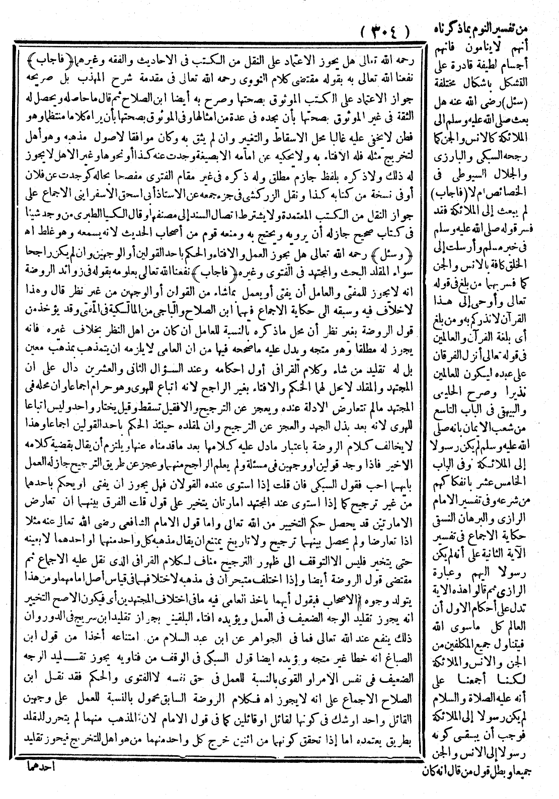 (فَأَجَابَ) نَفَعَنَا اللَّهُ تَعَالَى بِهِ بِقَوْلِهِ مُقْتَضَى كَلَامِ النَّوَوِيِّ - رَحِمَهُ اللَّهُ تَعَالَى - فِي مُقَدِّمَةِ شَرْحِ الْمُهَذَّبِ بَلْ صَرِيحُهُ جَوَازُ الِاعْتِمَادِ عَلَى الْكُتُبِ الْمَوْثُوقِ بِصِحَّتِهَا وَصَرَّحَ بِهِ أَيْضًا ابْنُ الصَّلَاحِ ثُمَّ قَالَ مَا حَاصِلُهُ وَيَحْصُلُ لَهُ الثِّقَةُ فِي غَيْرِ الْمَوْثُوقِ بِصِحَّتِهَا بِأَنْ يَجِدَهُ فِي عِدَّةٍ مِنْ أَمْثَالِهَا وَفِي الْمَوْثُوقِ بِصِحَّتِهَا بِأَنْ يَرَاهُ كَلَامًا مُنْتَظِمًا وَهُوَ فَطِنٌ لَا يَخْفَى عَلَيْهِ غَالِبًا مَحَلُّ الْإِسْقَاطِ وَالتَّغْيِيرِ وَإِنْ لَمْ يَثِقْ بِهِ وَكَانَ مُوَافِقًا لِأُصُولِ مَذْهَبِهِ وَهُوَ أَهْلٌ لِتَخْرِيجِ مِثْلِهِ فَلَهُ الْإِفْتَاءُ بِهِ وَلَا يَحْكِيهِ عَنْ إمَامِهِ إلَّا بِصِيغَةِ وَجَدْتُ عَنْهُ كَذَا أَوْ نَحْوِهَا وَغَيْرُ الْأَهْلِ لَا يَجُوزُ لَهُ ذَلِكَ وَلَا ذِكْرُهُ بِلَفْظٍ جَازِمٍ مُطْلَقٍ وَلَهُ ذِكْرُهُ فِي غَيْرِ مَقَامِ الْفَتْوَى مُفْصِحًا بِحَالِهِ كَ وَجَدْت عَنْ فُلَانٍ أَوْ فِي نُسْخَةٍ مِنْ كِتَابِهِ كَذَا وَنَقَلَ الزَّرْكَشِيُّ فِي جُزْءٍ جَمَعَهُ عَنْ الْأُسْتَاذِ أَبِي إِسْحَاقَ الْإسْفَرايِينِيّ الْإِجْمَاعَ عَلَى جَوَازِ النَّقْلِ مِنْ الْكُتُبِ الْمُعْتَمَدَةِ وَلَا يُشْتَرَطُ اتِّصَالُ السَّنَدِ إلَى مُصَنِّفِهَا وَقَالَ إِلْكِيَا الطَّبَرِيُّ مَنْ وَجَدَ شَيْئًا فِي كِتَابٍ صَحِيحٍ جَازَ لَهُ أَنْ يَرْوِيَهُ وَيَحْتَجَّ بِهِ وَمَنَعَهُ قَوْمٌ مِنْ أَصْحَابِ الْحَدِيثِ لِأَنَّهُ يَسْمَعُهُ وَهُوَ غَلَطٌ. اهـ.