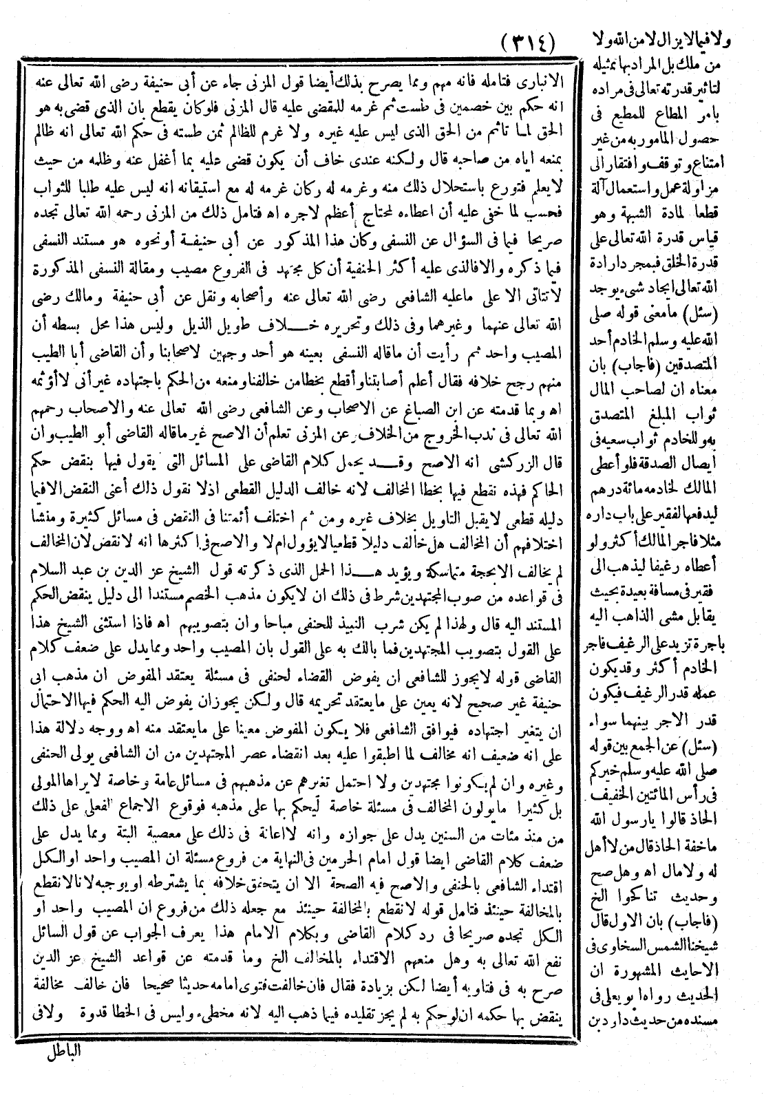 فَتَأَمَّلْ ذَلِكَ مِنْ الْمُزَنِيِّ - رَحِمَهُ اللَّهُ تَعَالَى - تَجِدْهُ صَرِيحًا فِيمَا فِي السُّؤَالِ عَنْ النَّسَفِيِّ وَكَانَ هَذَا الْمَذْكُورُ عَنْ أَبِي حَنِيفَةَ أَوْ نَحْوِهِ هُوَ مُسْتَنَدَ النَّسَفِيِّ فِيمَا ذَكَرَهُ وَإِلَّا فَاَلَّذِي عَلَيْهِ أَكْثَرُ الْحَنَفِيَّةِ أَنَّ كُلَّ مُجْتَهِدٍ فِي الْفُرُوعِ مُصِيبٌ وَمَقَالَةُ النَّسَفِيِّ الْمَذْكُورَةُ لَا تَتَأَتَّى إلَّا عَلَى مَا عَلَيْهِ الشَّافِعِيُّ - رَضِيَ اللَّهُ تَعَالَى عَنْهُ - وَأَصْحَابُهُ وَنُقِلَ عَنْ أَبِي حَنِيفَةَ وَمَالِكٍ - رَضِيَ اللَّهُ تَعَالَى عَنْهُمَا - وَغَيْرِهِمَا وَفِي ذَلِكَ وَتَحْرِيرِهِ خِلَافٌ طَوِيلُ الذَّيْلِ وَلَيْسَ هَذَا مَحَلُّ بَسْطِهِ أَنَّ الْمُصِيبَ وَاحِدٌ ثُمَّ رَأَيْتُ أَنَّ مَا قَالَهُ النَّسَفِيُّ بِعَيْنِهِ هُوَ أَحَدُ وَجْهَيْنِ لِأَصْحَابِنَا وَأَنَّ الْقَاضِيَ أَبَا الطَّيِّبِ مِنْهُمْ رَجَّحَ خِلَافَهُ.