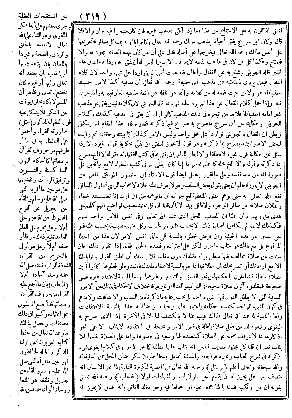 فَإِنَّ هَذَا الْمَقَامَ قَدْ يُشْكِلُ وَيُظَنُّ أَنَّ الْقَفَّالَ وَالْجُوَيْنِيَّ تَوَارَدَا عَلَى مَحَلٍّ وَاحِدٍ وَلَيْسَ الْأَمْرُ كَذَلِكَ كَمَا بَيَّنْته وَحَقَّقْته ثُمَّ رَأَيْت لِبَعْضِ الْأُصُولِيِّينَ مَا يُصَرِّحُ بِمَا ذَكَرْته وَهُوَ قَوْلُهُ لَا يَجُوزُ لِلْمُفْتِي أَنْ يُفْتِيَ بِحِكَايَةِ قَوْلِ غَيْرِهِ إلَّا إذَا سُئِلَ عَنْ حِكَايَةِ قَوْلِ غَيْرِهِ لَا مُطْلَقًا وَإِلَّا لَجَازَ لِلْعَامِّيِّ أَنْ يُفْتِيَ بِمَا فِي كُتُبِ الْفُقَهَاءِ. اهـ.