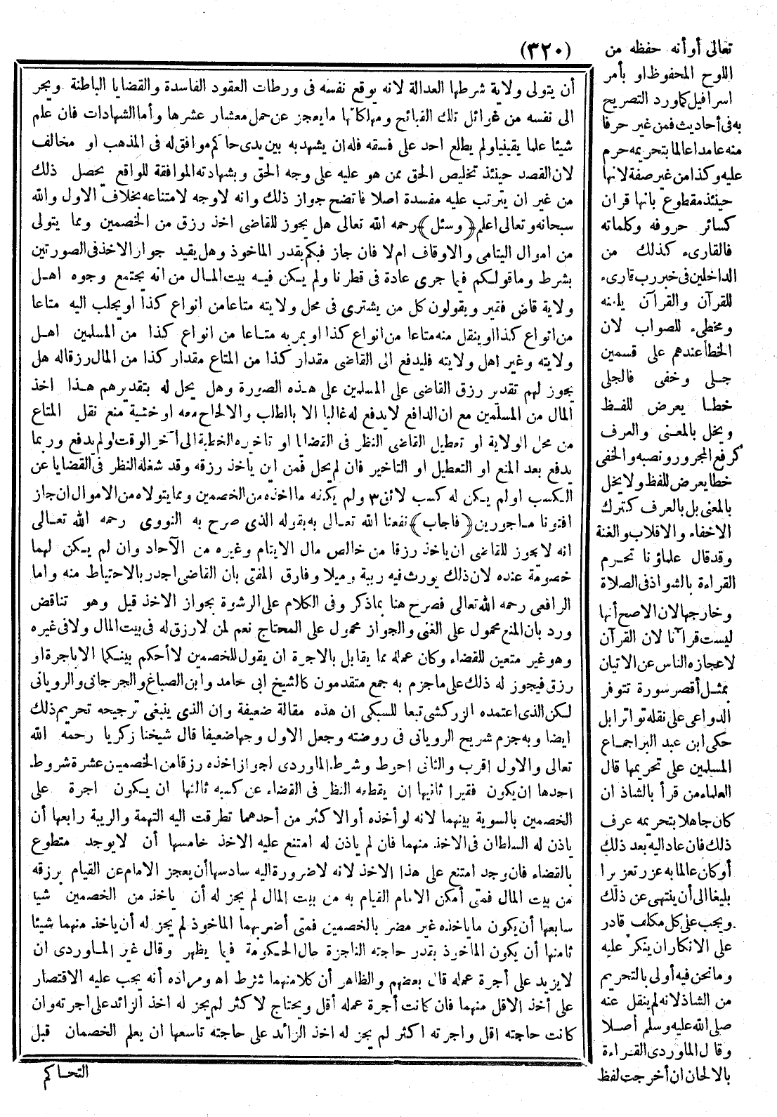 فَمَتَى أَمْكَنَ الْإِمَامَ الْقِيَامُ بِهِ مِنْ بَيْتِ الْمَالِ لَمْ يَجُزْ لَهُ أَنْ يَأْخُذَ مِنْ الْخَصْمَيْنِ شَيْئًا سَابِعُهَا أَنْ يَكُونَ مَا يَأْخُذُهُ غَيْرَ مُضِرٍّ بِالْخَصْمَيْنِ فَمَتَى أَضَرَّ بِهِمَا الْمَأْخُوذُ لَمْ يَجُزْ لَهُ أَنْ يَأْخُذَ مِنْهُمَا شَيْئًا ثَامِنُهَا أَنْ يَكُونَ الْمَأْخُوذُ بِقَدْرِ حَاجَتِهِ النَّاجِزَةِ حَالَ الْحُكُومَةِ فِيمَا يَظْهَرُ. وَقَالَ غَيْرُ الْمَاوَرْدِيُّ أَنْ لَا يَزِيدَ عَلَى أُجْرَةِ عَمَلِهِ قَالَ بَعْضُهُمْ وَالظَّاهِرُ أَنَّ كُلًّا مِنْهُمَا شَرْطٌ. اهـ. وَمُرَادُهُ أَنَّهُ يَجِبُ عَلَيْهِ الِاقْتِصَارُ عَلَى أَخْذِ الْأَقَلِّ مِنْهُمَا فَإِنْ كَانَتْ أُجْرَةُ عَمَلِهِ أَقَلَّ وَيَحْتَاجُ لِأَكْثَرَ لَمْ يَجُزْ لَهُ أَخْذُ الزَّائِدِ عَلَى أُجْرَتِهِ وَإِنْ كَانَتْ حَاجَتُهُ أَقَلَّ وَأُجْرَتُهُ أَكْثَرَ لَمْ يَجُزْ لَهُ أَخْذُ الزَّائِدِ عَلَى حَاجَتِهِ تَاسِعُهَا أَنْ يَعْلَمَ الْخَصْمَانِ قَبْلَ