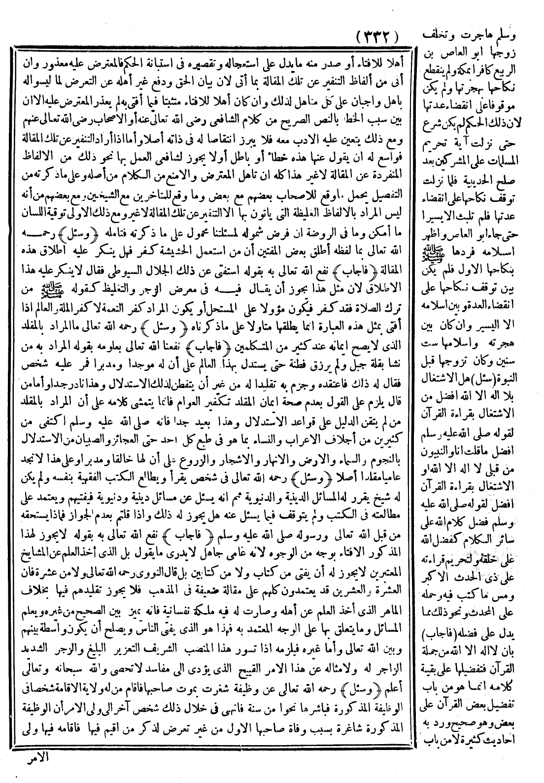 أَهْلًا لِلْإِفْتَاءِ أَوْ صَدَرَ مِنْهُ مَا يَدُلُّ عَلَى اسْتِعْجَالِهِ وَتَقْصِيرِهِ فِي اسْتِبَانَةِ الْحُكْمِ فَالْمُعْتَرِضُ عَلَيْهِ مَعْذُورٌ وَإِنْ أَتَى مِنْ أَلْفَاظِ التَّنْفِيرِ عَنْ تِلْكَ الْمَقَالَةِ بِمَا أَتَى لِأَنَّ بَيَانَ الْحَقِّ وَدَفْعَ غَيْرِ أَهْلِهِ عَنْ التَّعَرُّضِ لِمَا لَيْسُوا لَهُ بِأَهْلٍ وَاجِبَانِ عَلَى مُتَأَهِّلٍ لِذَلِكَ وَإِنْ كَانَ أَهْلًا لِلْإِفْتَاءِ مُتَثَبِّتًا فِيمَا أَفْتَى بِهِ لَمْ يُعْذَرْ الْمُعْتَرَضُ عَلَيْهِ إلَّا إنْ بَيَّنَ سَبَبَ الْخَطَإِ بِالنَّصِّ الصَّرِيحِ مِنْ كَلَامِ الشَّافِعِيِّ - رَضِيَ اللَّهُ تَعَالَى عَنْهُ - أَوْ الْأَصْحَابِ - رَضِيَ اللَّهُ تَعَالَى عَنْهُمْ - وَمَعَ ذَلِكَ يَتَعَيَّنُ عَلَيْهِ الْأَدَبُ مَعَهُ فَلَا يُبْرِزُ انْتِقَاصًا لَهُ فِي ذَاتِهِ أَصْلًا وَأَمَّا إذَا أَرَادَ التَّنْفِيرَ عَنْ تِلْكَ الْمَقَالَةِ فَوَاسِعٌ لَهُ أَنْ يَقُولَ عَنْهَا هَذِهِ خَطَأٌ أَوْ بَاطِلٌ أَوْ لَا يَجُوزُ لِشَافِعِيٍّ الْعَمَلُ بِهَا أَوْ نَحْوَ ذَلِكَ مِنْ الْأَلْفَاظِ الْمُنَفِّرَةِ عَنْ الْمَقَالَةِ لَا غَيْرُ هَذَا كُلُّهُ إنْ تَأَهَّلَ الْمُعْتَرِضُ وَإِلَّا مُنِعَ مِنْ الْكَلَامِ مِنْ أَصْلِهِ وَعَلَى مَا ذَكَرْته مِنْ التَّفْصِيلِ يُحْمَلُ مَا وَقَعَ لِلْأَصْحَابِ بَعْضِهِمْ مَعَ بَعْضٍ وَمَا وَقَعَ لِلْمُتَأَخِّرِينَ مَعَ الشَّيْخَيْنِ وَمَعَ بَعْضِهِمْ مِنْ أَنَّهُ لَيْسَ الْمُرَادُ بِالْأَلْفَاظِ الْغَلِيظَةِ الَّتِي يَأْتُونَ بِهَا إلَّا التَّنْفِيرَ عَنْ تِلْكَ الْمَقَالَةِ لَا غَيْرُ.