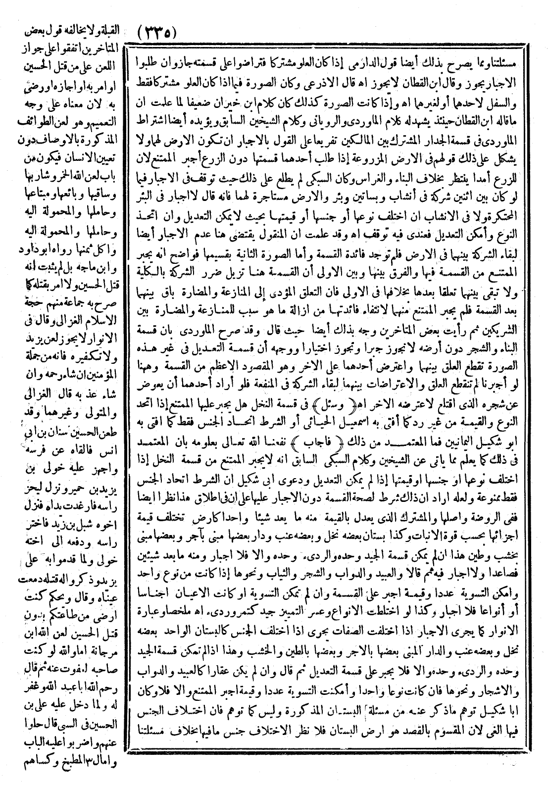 مَسْأَلَتِنَا وَمِمَّا يُصَرِّحُ بِذَلِكَ أَيْضًا قَوْلُ الدَّارِمِيِّ إذَا كَانَ الْعُلُوُّ مُشْتَرَكًا فَتَرَاضَوْا عَلَى قِسْمَتِهِ جَازَ وَإِنْ طَلَبُوا الْإِجْبَارَ يَجُوزُ وَقَالَ ابْنُ الْقَطَّانِ لَا يَجُوزُ. اهـ.