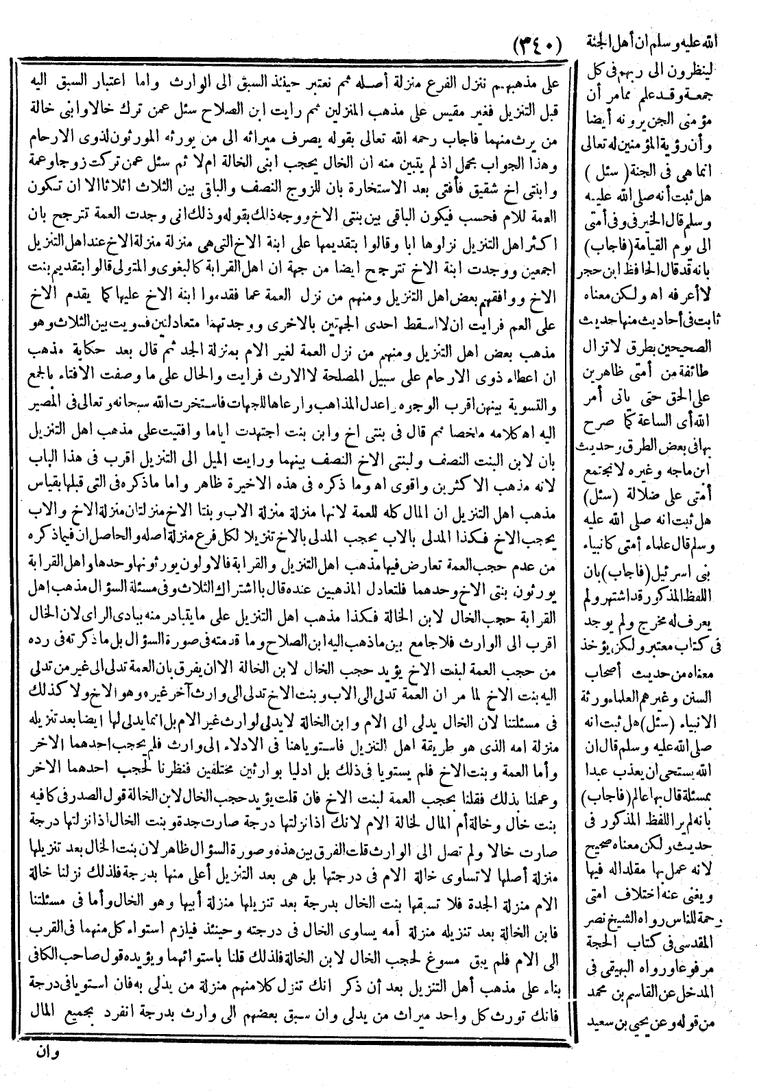 ثُمَّ سُئِلَ عَمَّنْ تَرَكَتْ زَوْجًا وَعَمَّةً وَابْنَتَيْ أَخٍ شَقِيقٍ فَأَفْتَى بَعْدَ الِاسْتِخَارَةِ بِأَنَّ لِلزَّوْجِ النِّصْفَ وَالْبَاقِيَ بَيْنَ الثَّلَاثِ أَثْلَاثًا إلَّا أَنْ تَكُونَ الْعَمَّةُ لِلْأُمِّ فَحَسْبُ فَيَكُونُ الْبَاقِي بَيْنَ بِنْتَيْ الْأَخِ وَوَجَّهَ ذَلِكَ بِقَوْلِهِ وَذَلِكَ أَنِّي وَجَدْتُ الْعَمَّةَ تَتَرَجَّحُ بِأَنَّ أَكْثَرَ أَهْلِ التَّنْزِيلِ نَزَّلُوهَا أَبًا وَقَالُوا بِتَقْدِيمِهَا عَلَى ابْنَةِ الْأَخِ الَّتِي هِيَ مُنَزَّلَةٌ مَنْزِلَةَ الْأَخِ عِنْدَ أَهْلِ التَّنْزِيلِ أَجْمَعِينَ وَوَجَدْتُ ابْنَةَ الْأَخِ تَتَرَجَّحُ أَيْضًا مِنْ جِهَةِ أَنَّ أَهْلَ الْقَرَابَةِ كَالْبَغَوِيِّ وَالْمُتَوَلِّي قَالُوا بِتَقْدِيمِ بِنْتِ الْأَخِ وَوَافَقَهُمْ بَعْضُ أَهْلِ التَّنْزِيلِ وَمِنْهُمْ مَنْ نَزَّلَ الْعَمَّةَ عَمًّا فَقَدَّمُوا ابْنَةَ الْأَخِ عَلَيْهَا.